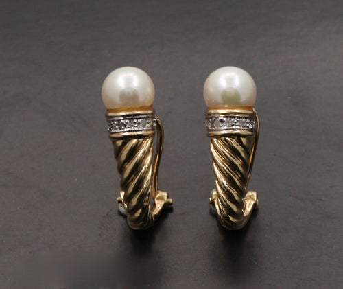Vintage Shrimp Style Pearl Diamonds 14K Yellow White Gold Earrings