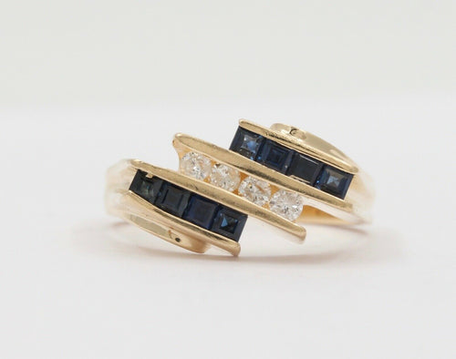 Vintage Geometric Bypass Diamonds Sapphires 14K Yellow Gold Ring