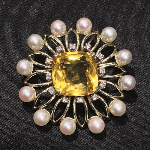 Vintage 18K Brooch Citrine Diamonds Pearls