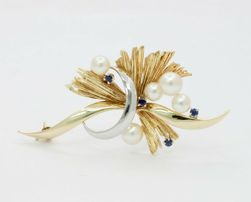 Art Nouveau 10K Yellow Gold Sapphire Pearl Brooch