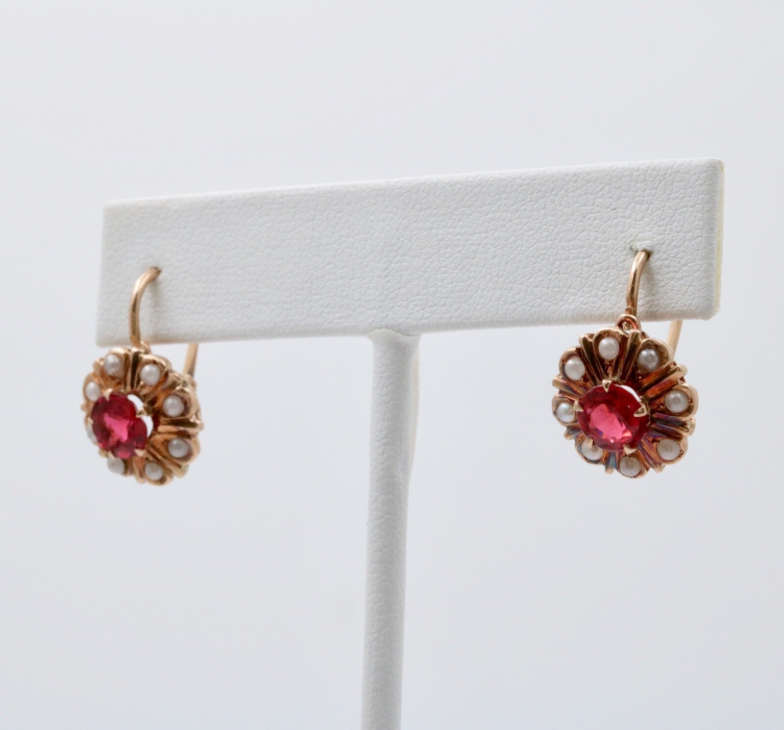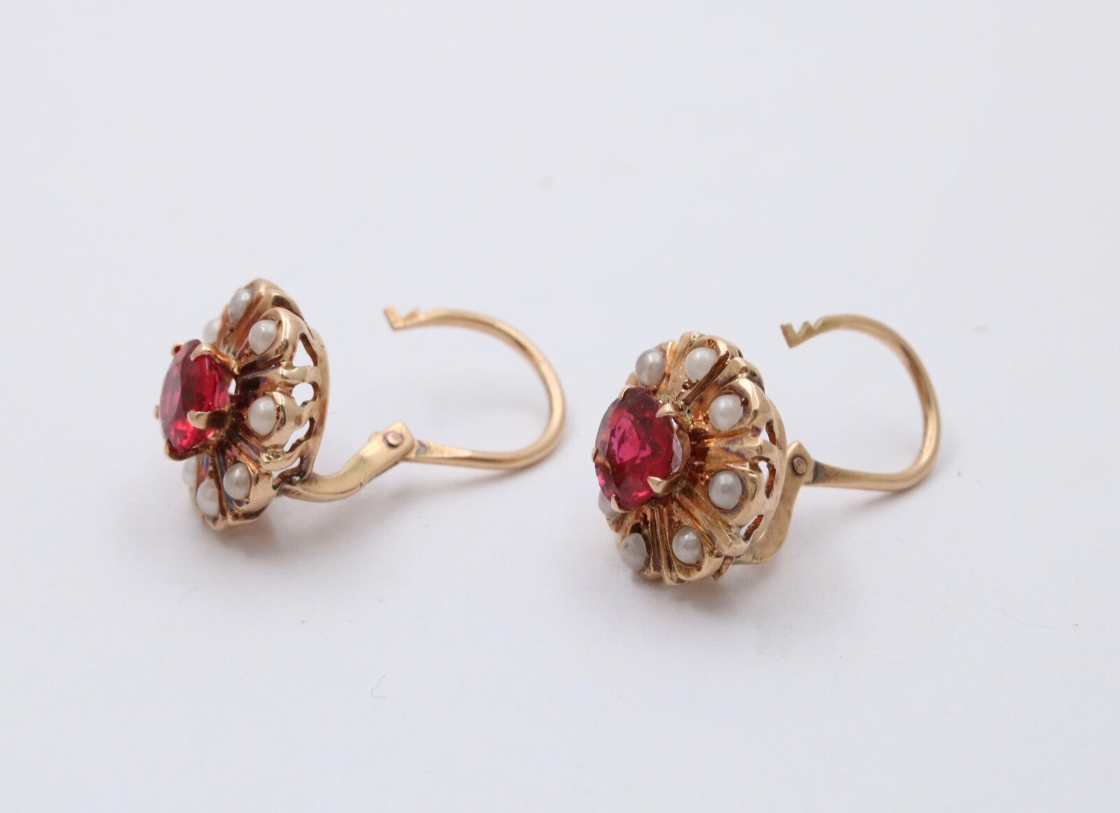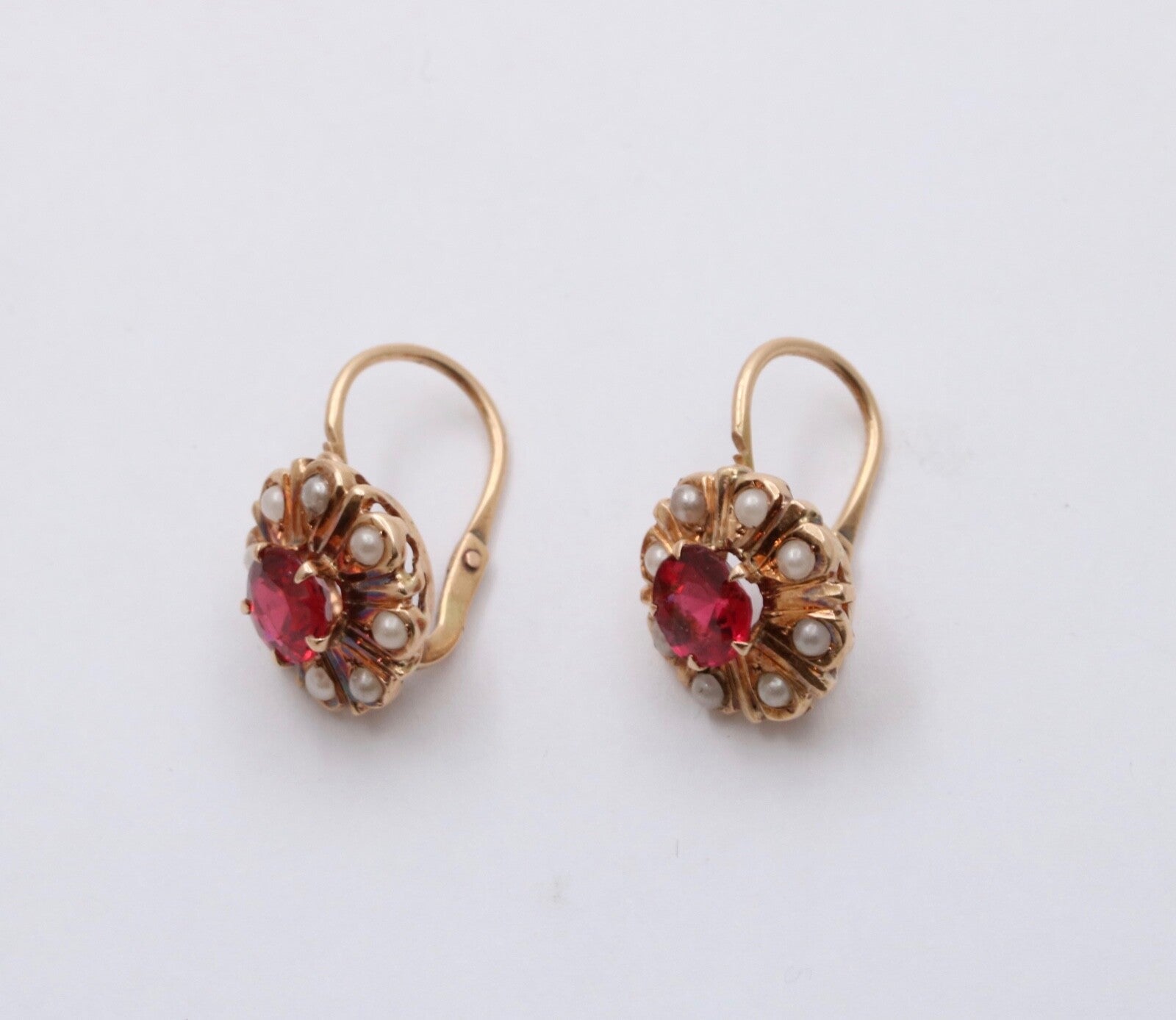 The pair of antique sweet drop earrings are crafted in warm 14K yellow gold featuring round cut paste with rich cranberry color. The shimmering split pearls are given added sweetness by shape of the flower.