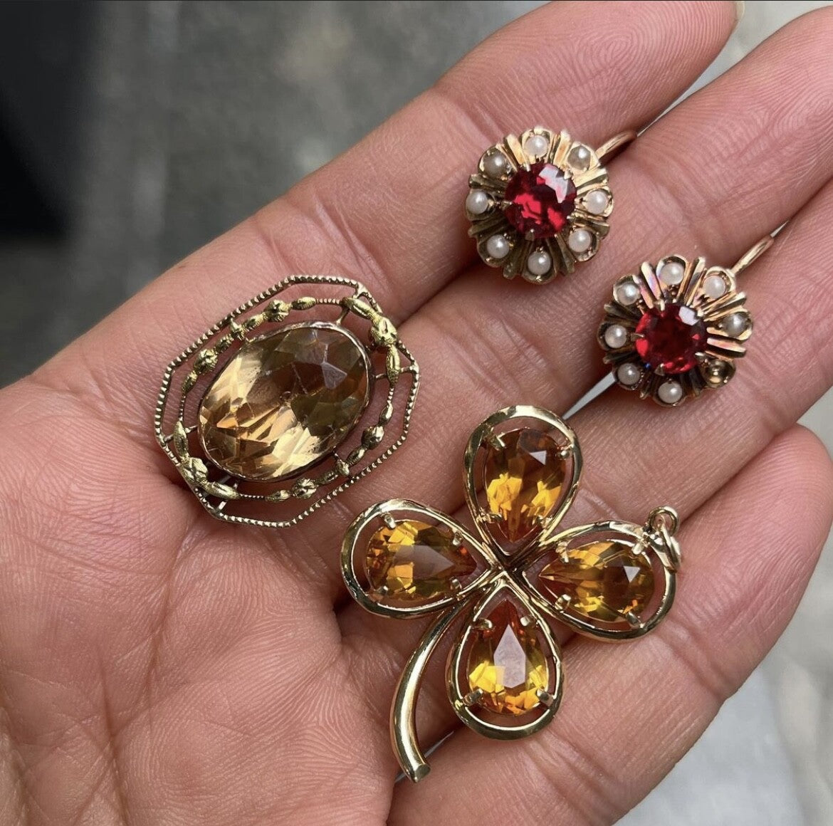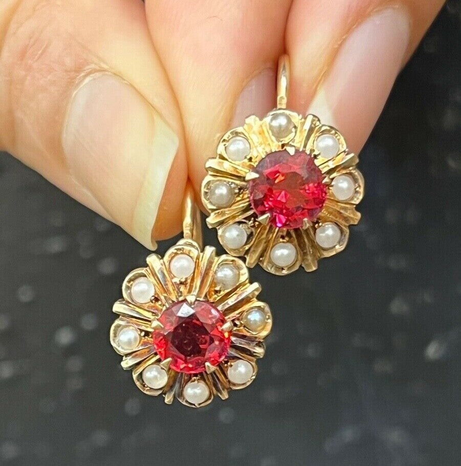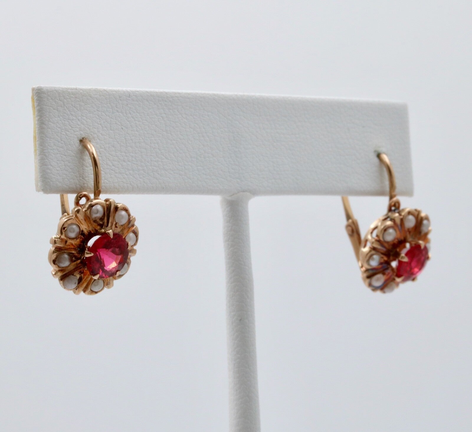 The pair of antique sweet drop earrings are crafted in warm 14K yellow gold featuring round cut paste with rich cranberry color. The shimmering split pearls are given added sweetness by shape of the flower.