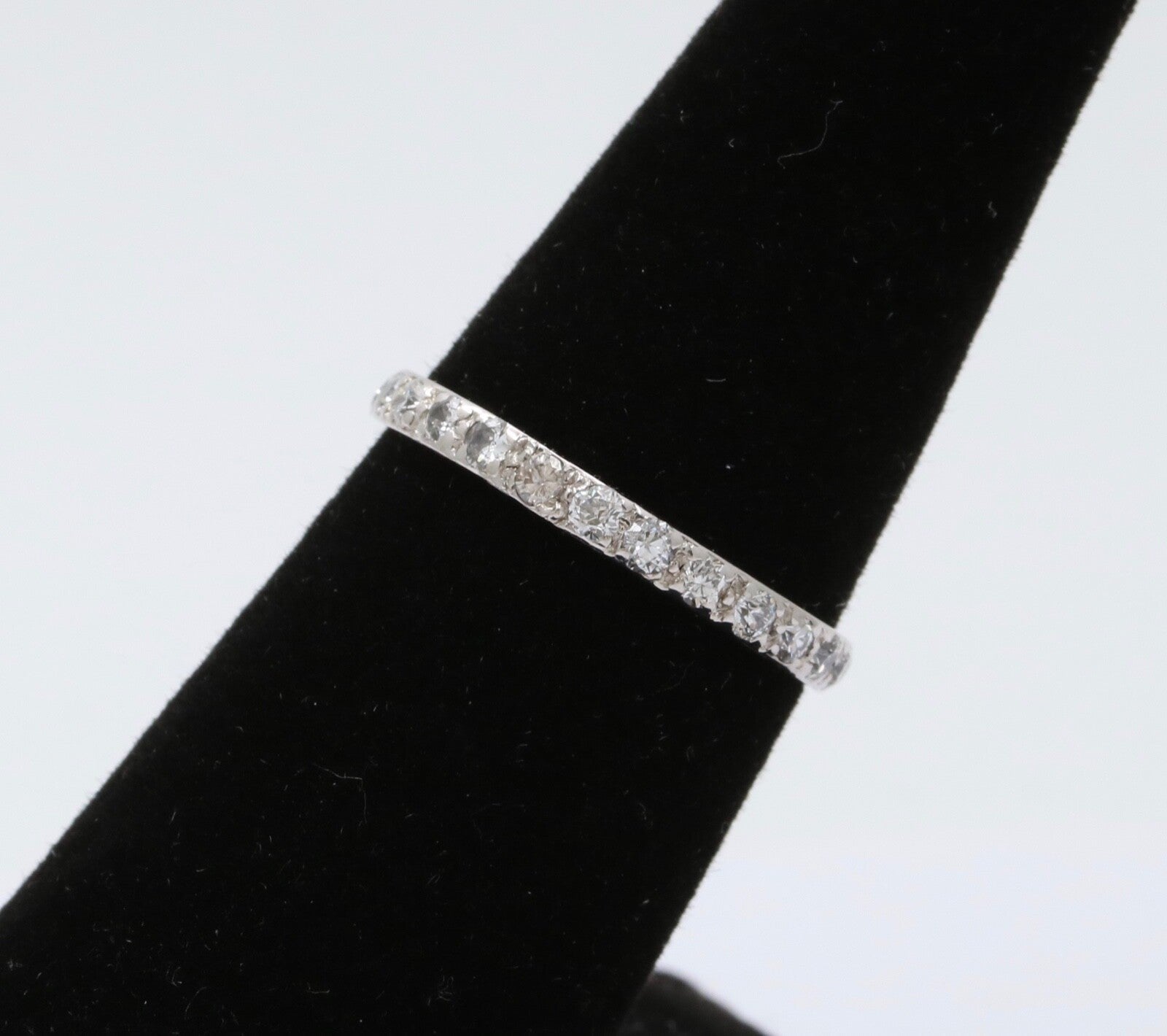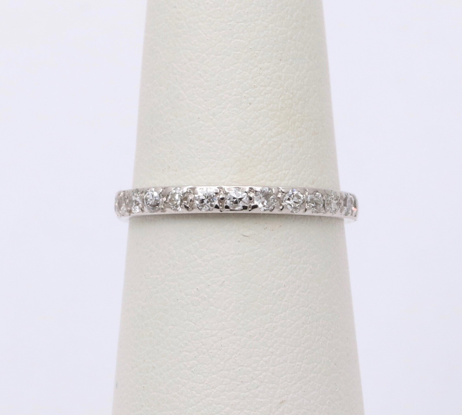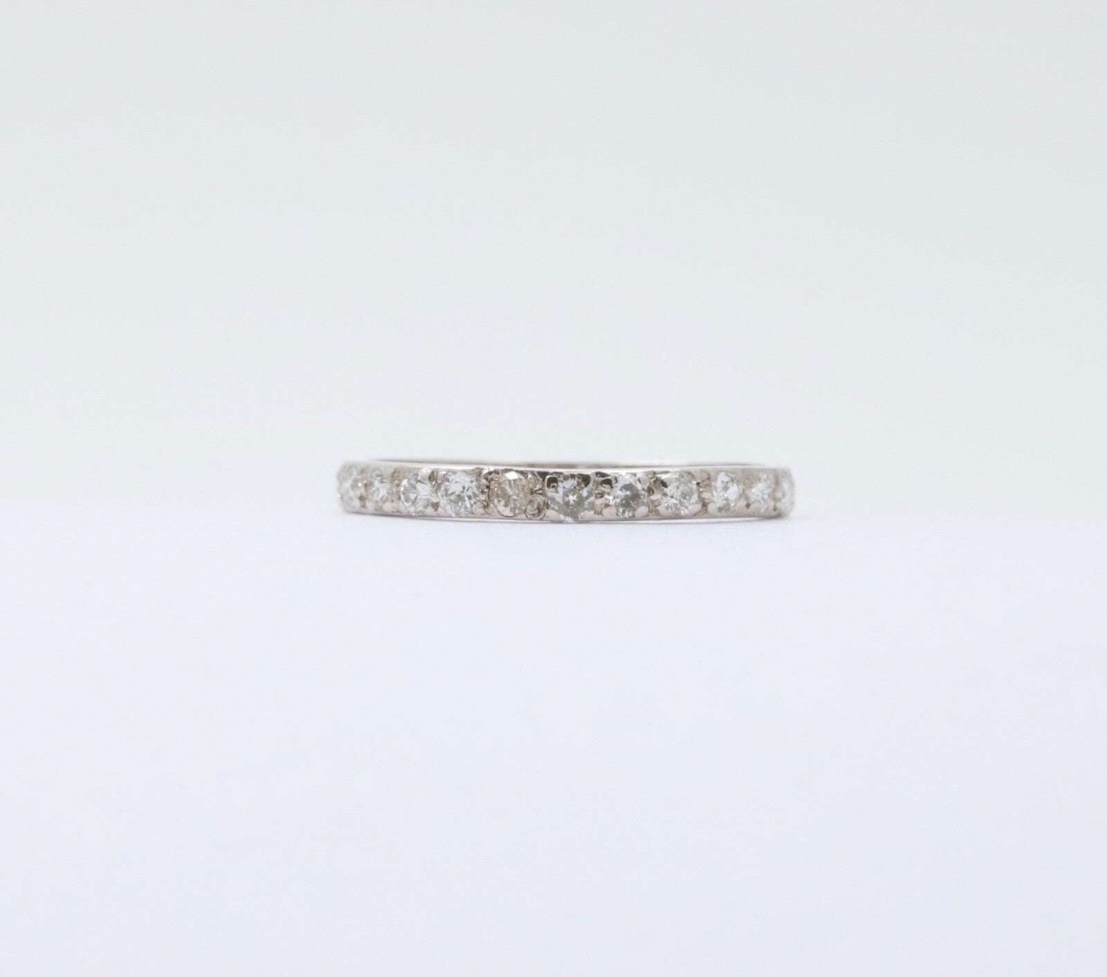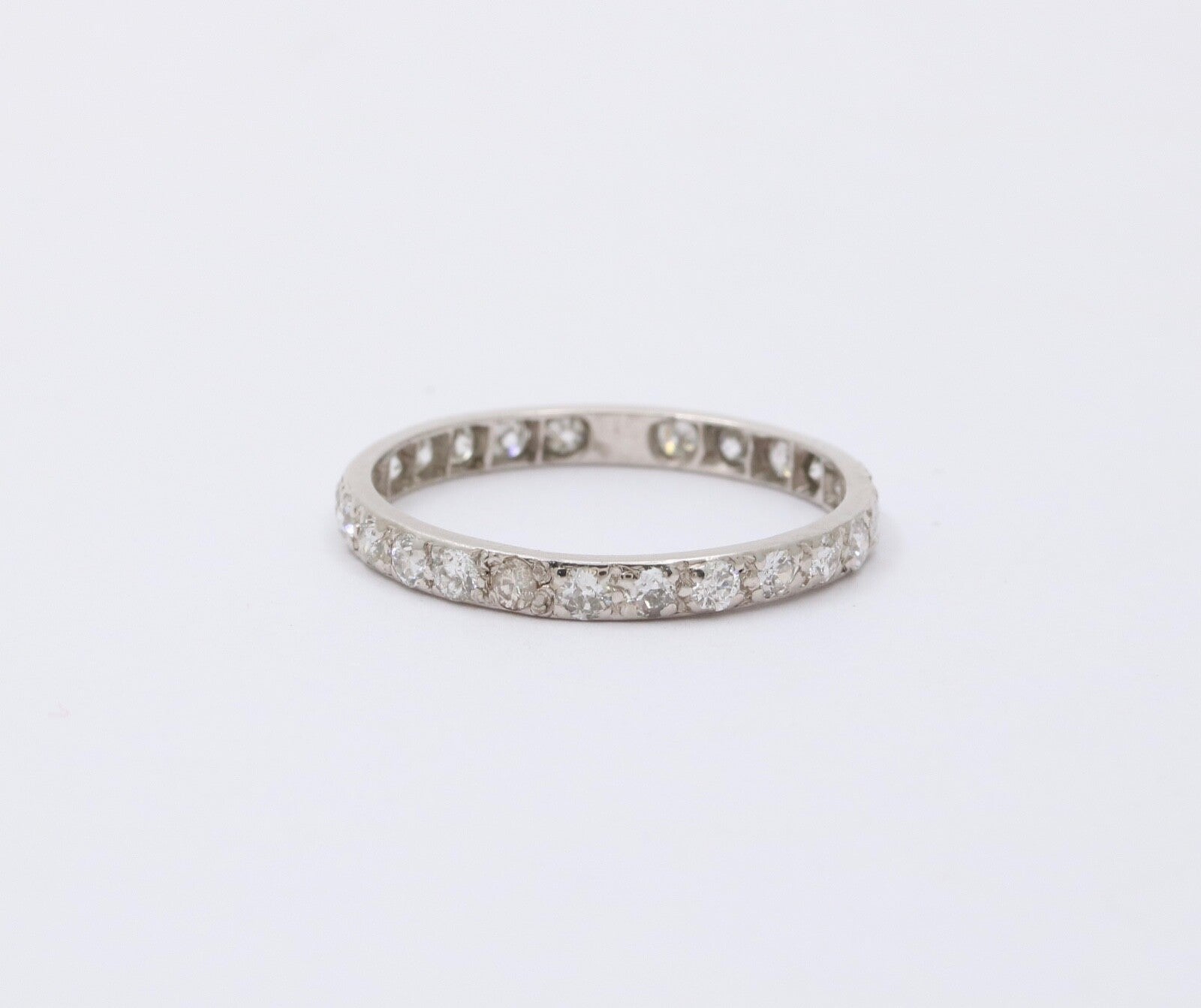 Very Popular these days! An Art Deco Eternity Band in 18K White Gold. Perfect alone or as a Stacking Band with your other Rings! This Ring is Handmade with shared Bead Prongs. Very Pretty and a Perfect gift!