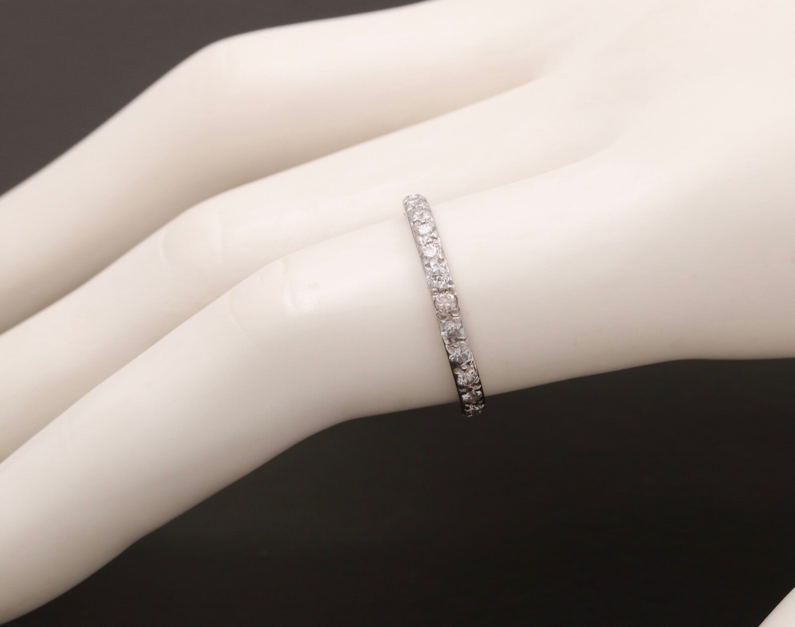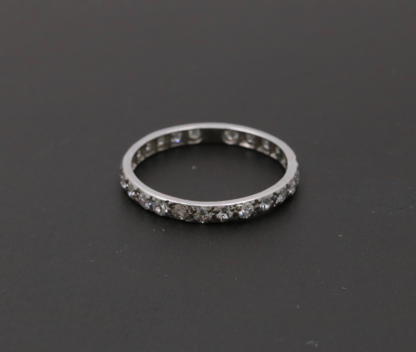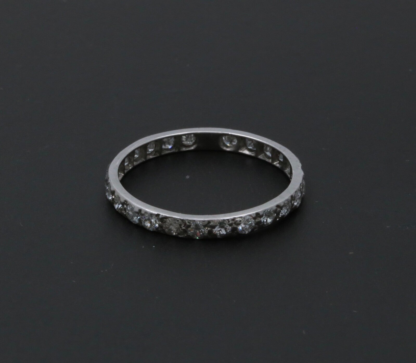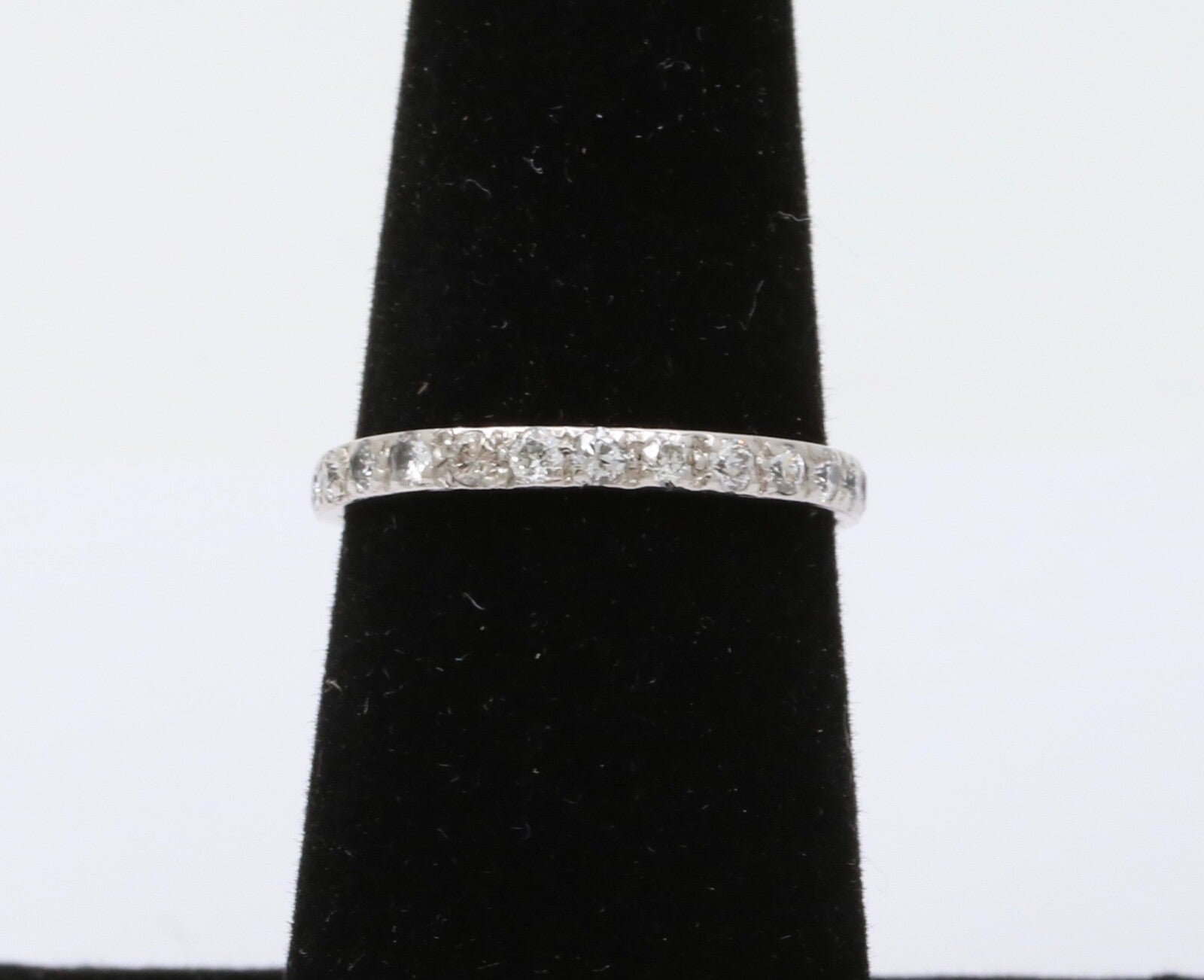 Very Popular these days! An Art Deco Eternity Band in 18K White Gold. Perfect alone or as a Stacking Band with your other Rings! This Ring is Handmade with shared Bead Prongs. Very Pretty and a Perfect gift!