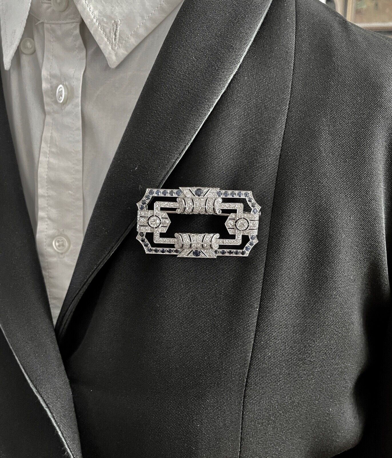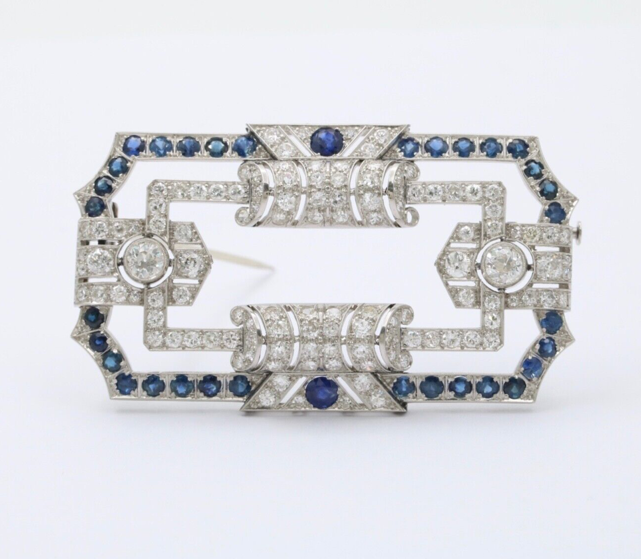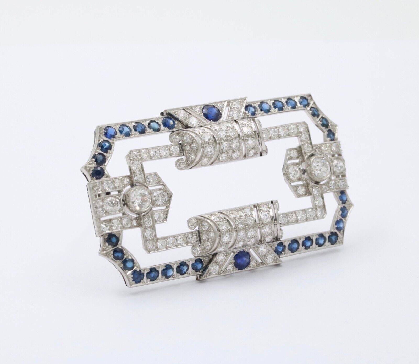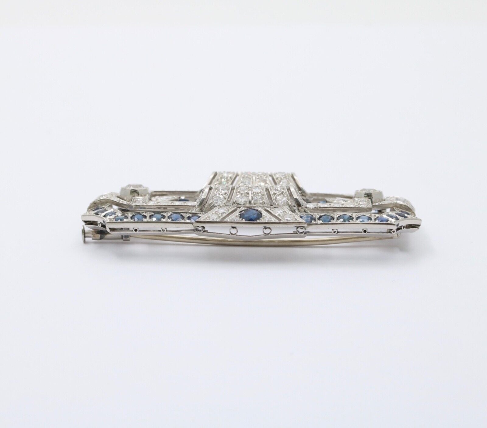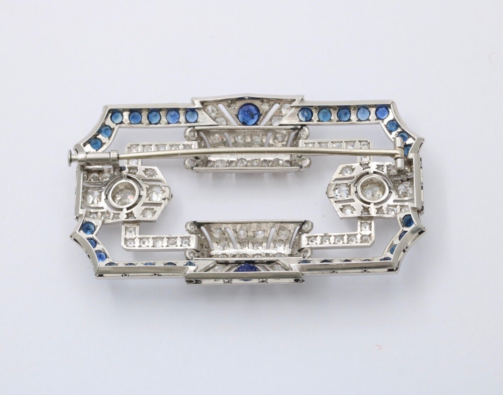 This is a handsome antique Art Deco platinum brooch featuring a mix of old mine cut, brilliant cut and single cut diamonds weighing approximately 5.5 carats G/H in color, SI in clarity and dazzling sapphire are all the way around. Its symmetrical design gives this pin for such an elegant and classic Art Deco. This brooch is perfect for any occasion or event you have coming up. This would make the perfect gift for your loved one or a lovely treat for yourself!