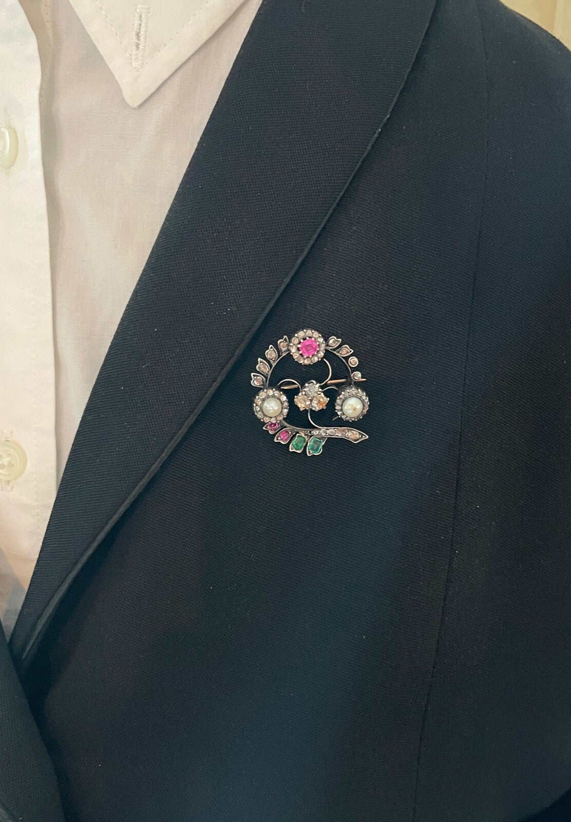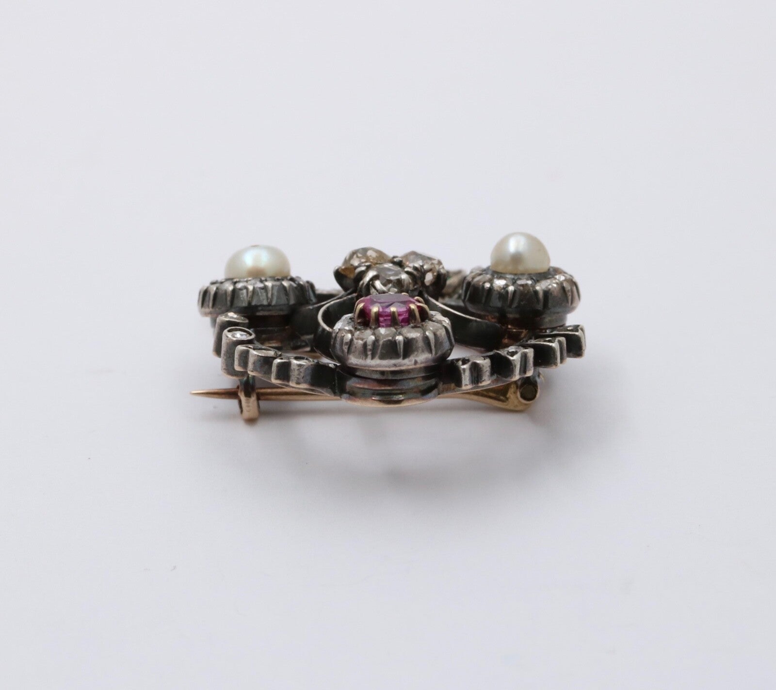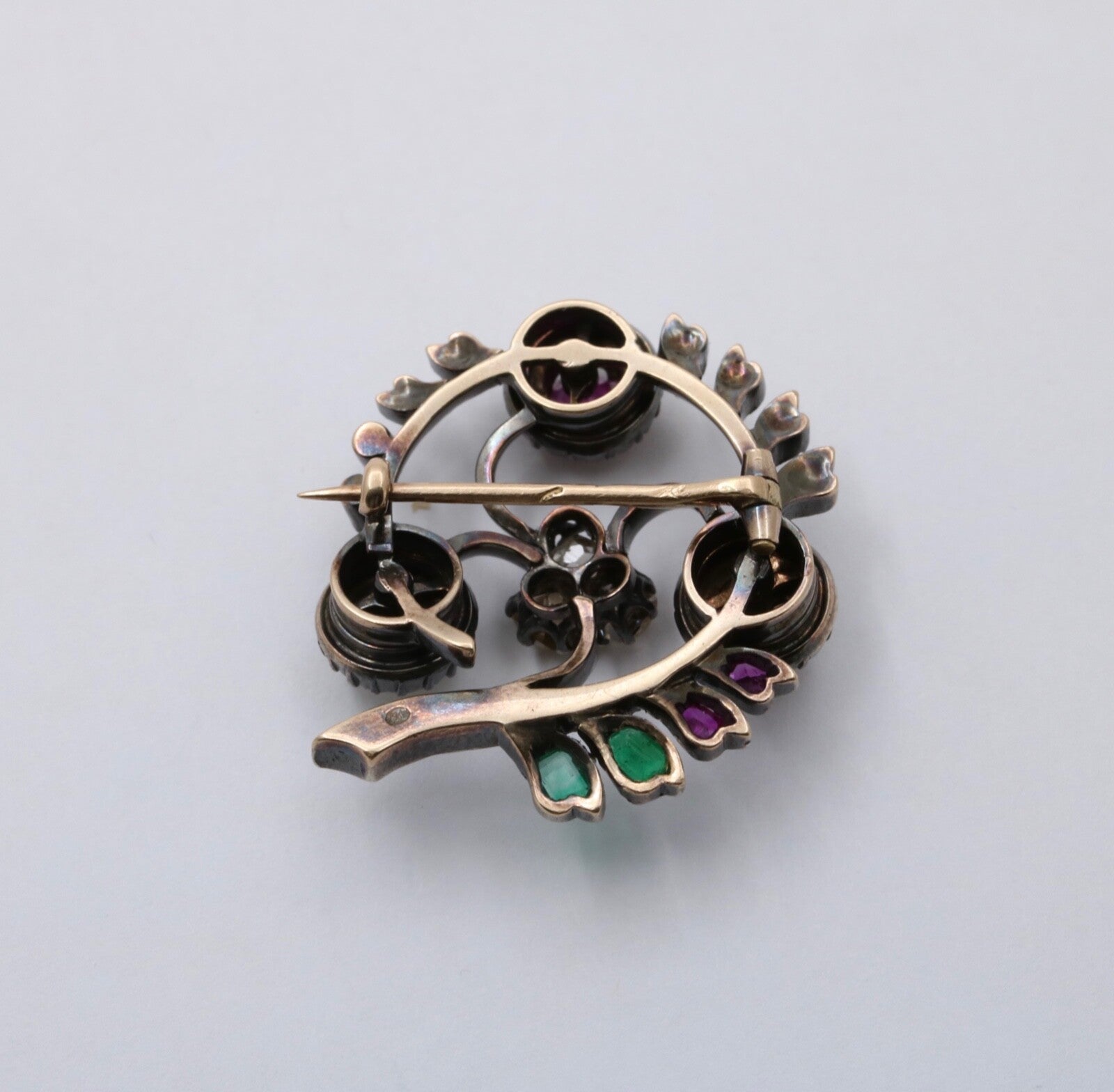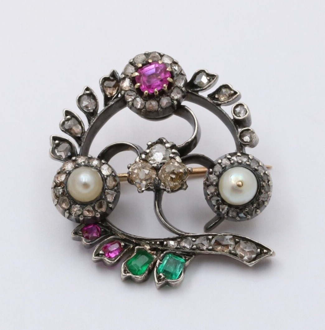 A lovely flowing floral design brooch from the early Edwardian period. Leaf and Flower in circle shape, this antique sterling silver over 14K yellow gold brooch is set with sparkly rose cut and old mine cut diamonds, Pearl, emerald and pink stones. A beautiful example for your collection.