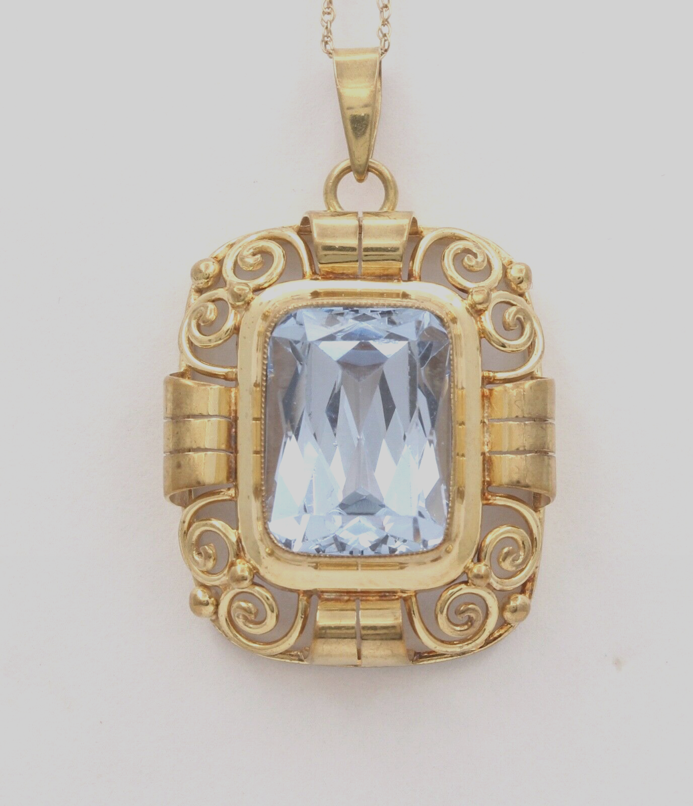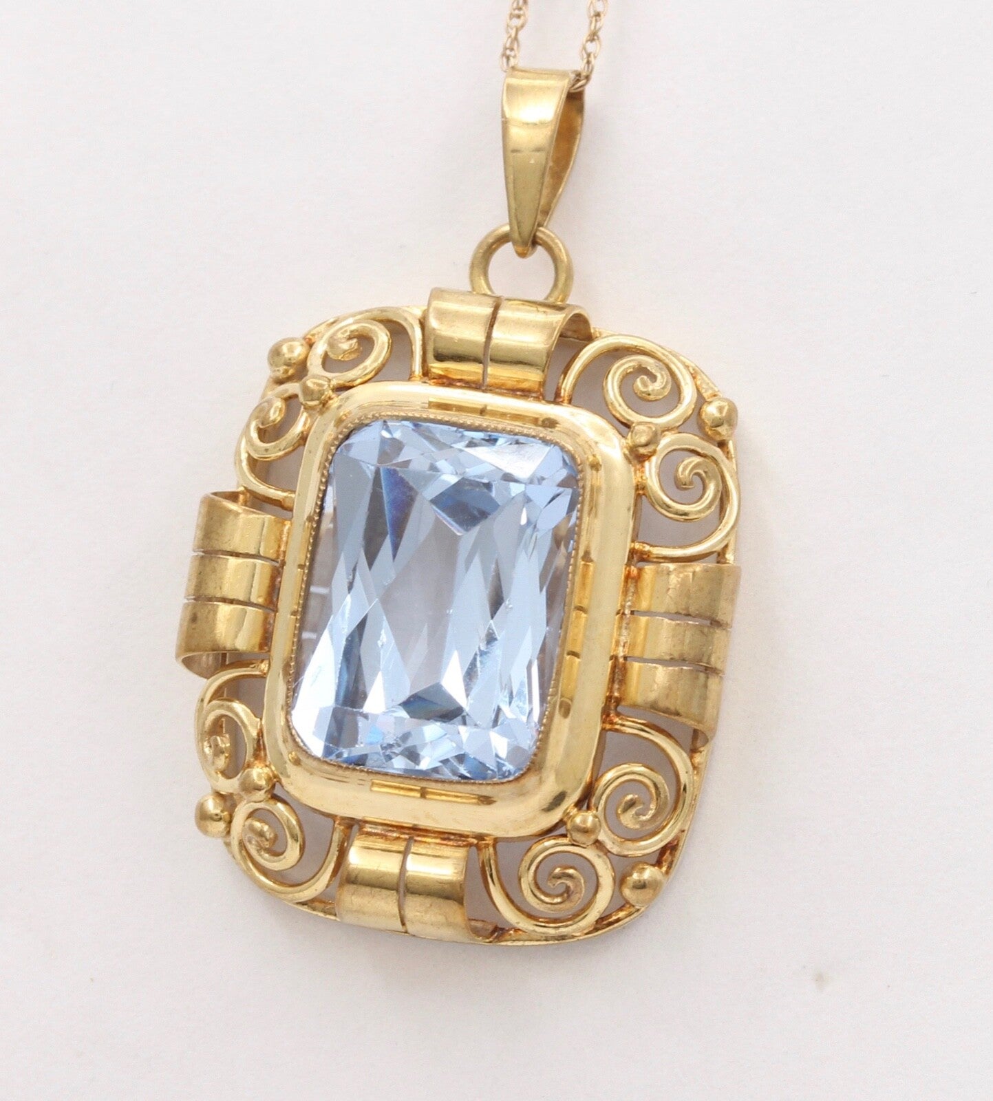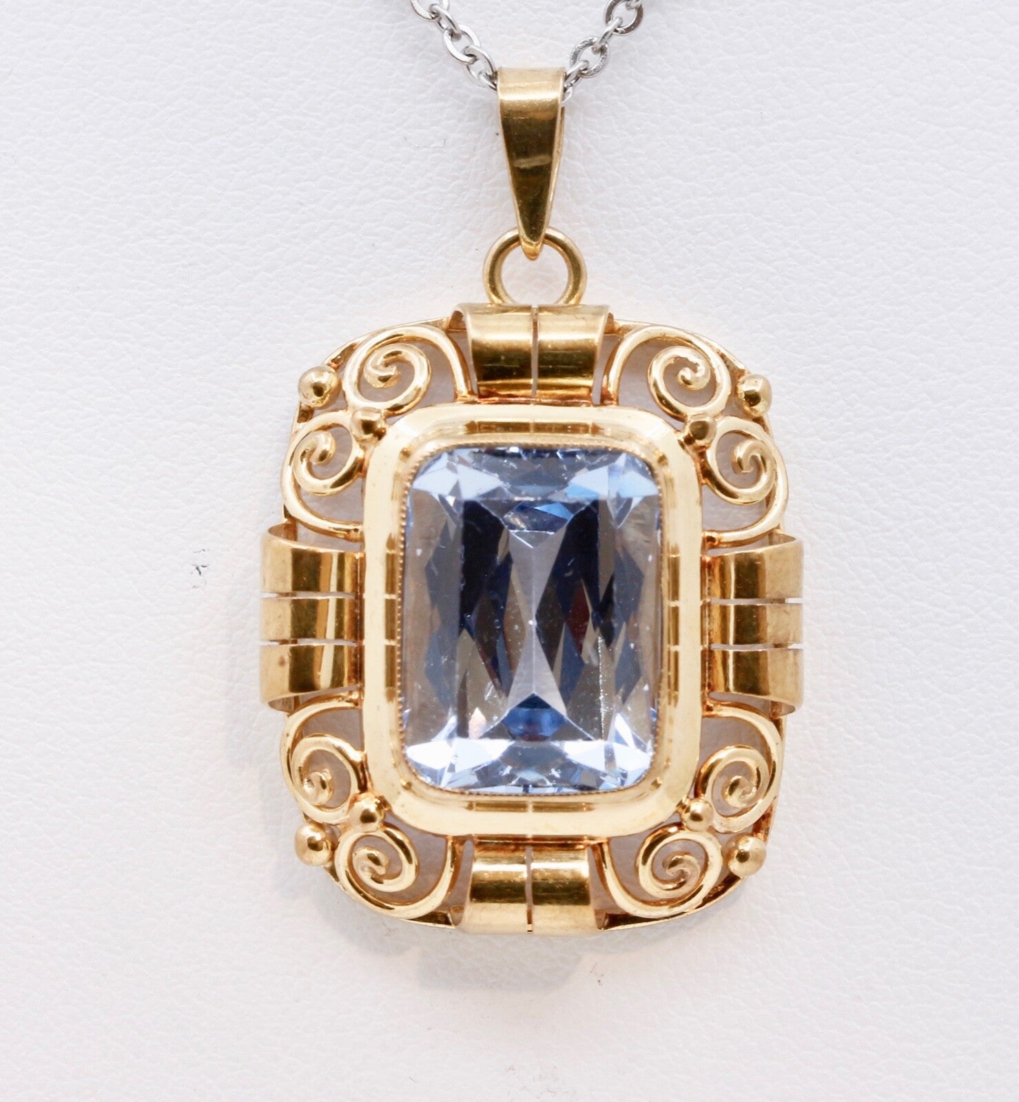 A Lovely Mid Century Ladies Pendant. The Stone is a Synthetic Aquamarine, in an Emerald Cut Style. Scroll Work, Beads and Banner Loops create a design that is elegant and beautiful. A nice sized bale works with many chain sizes. Your friends will absolutely compliment you on this piece!