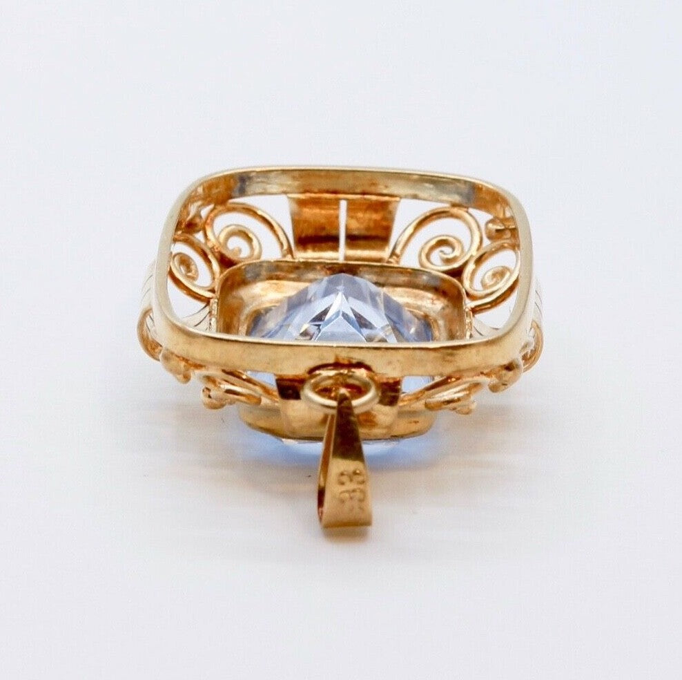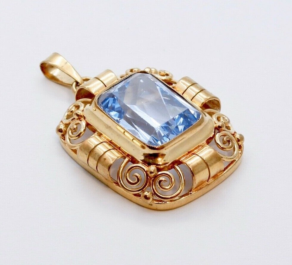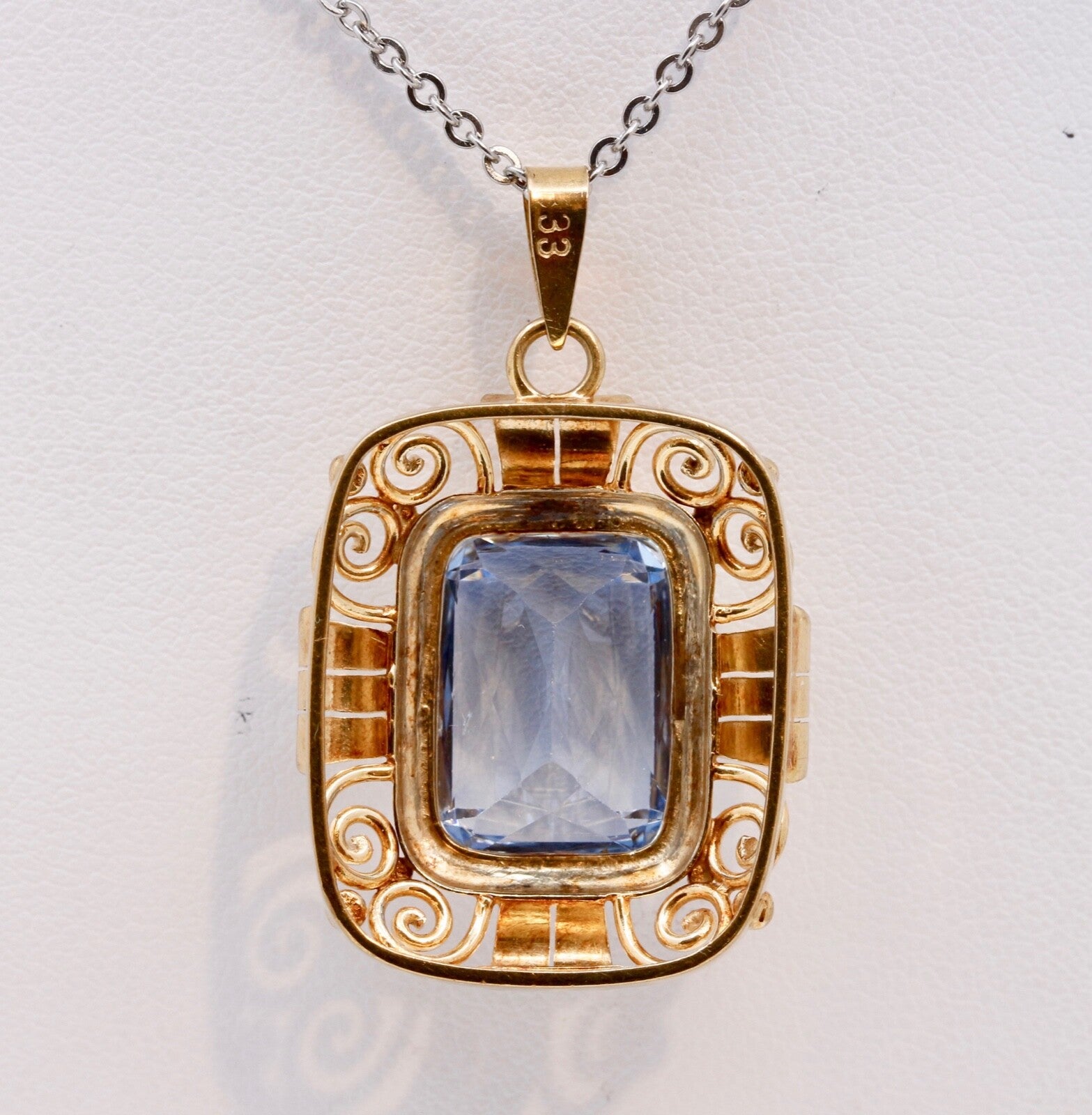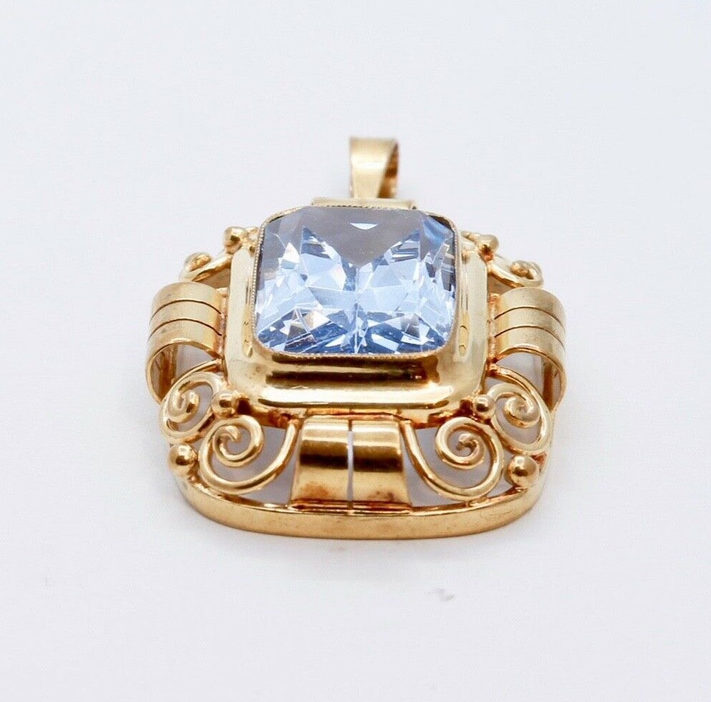 A Lovely Mid Century Ladies Pendant. The Stone is a Synthetic Aquamarine, in an Emerald Cut Style. Scroll Work, Beads and Banner Loops create a design that is elegant and beautiful. A nice sized bale works with many chain sizes. Your friends will absolutely compliment you on this piece!