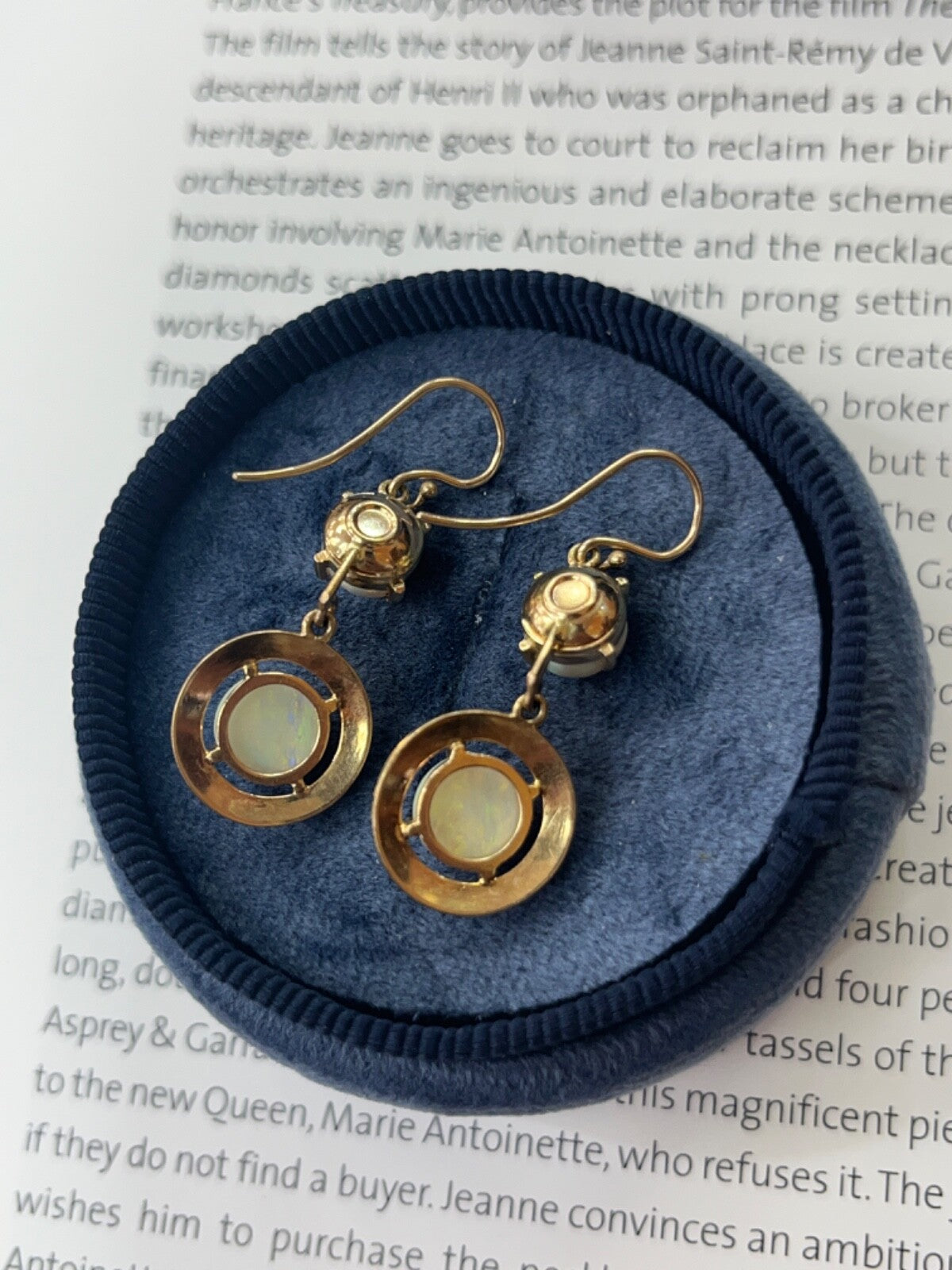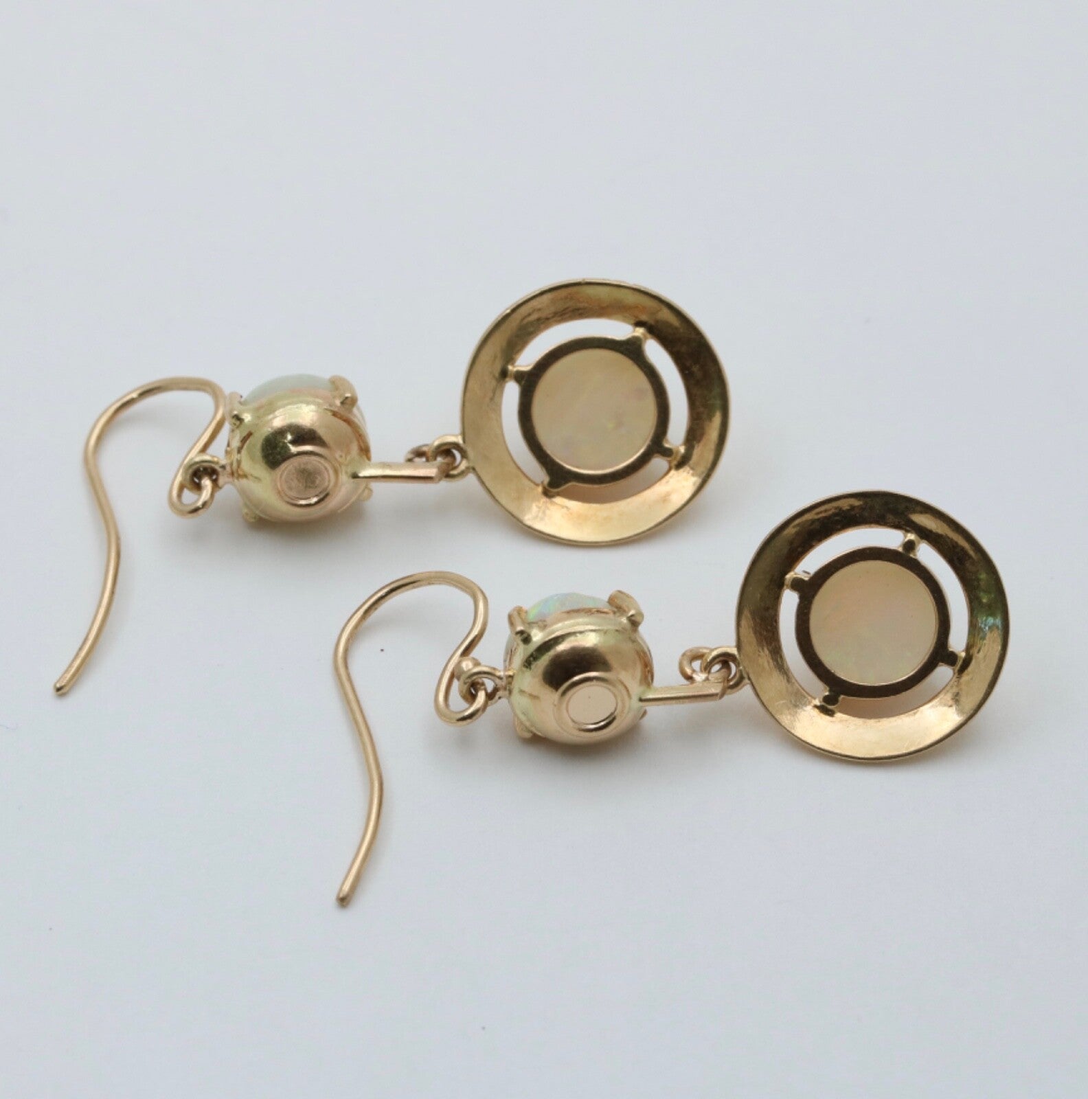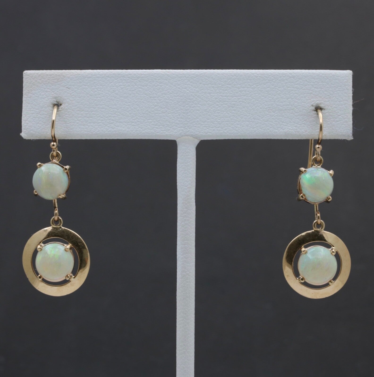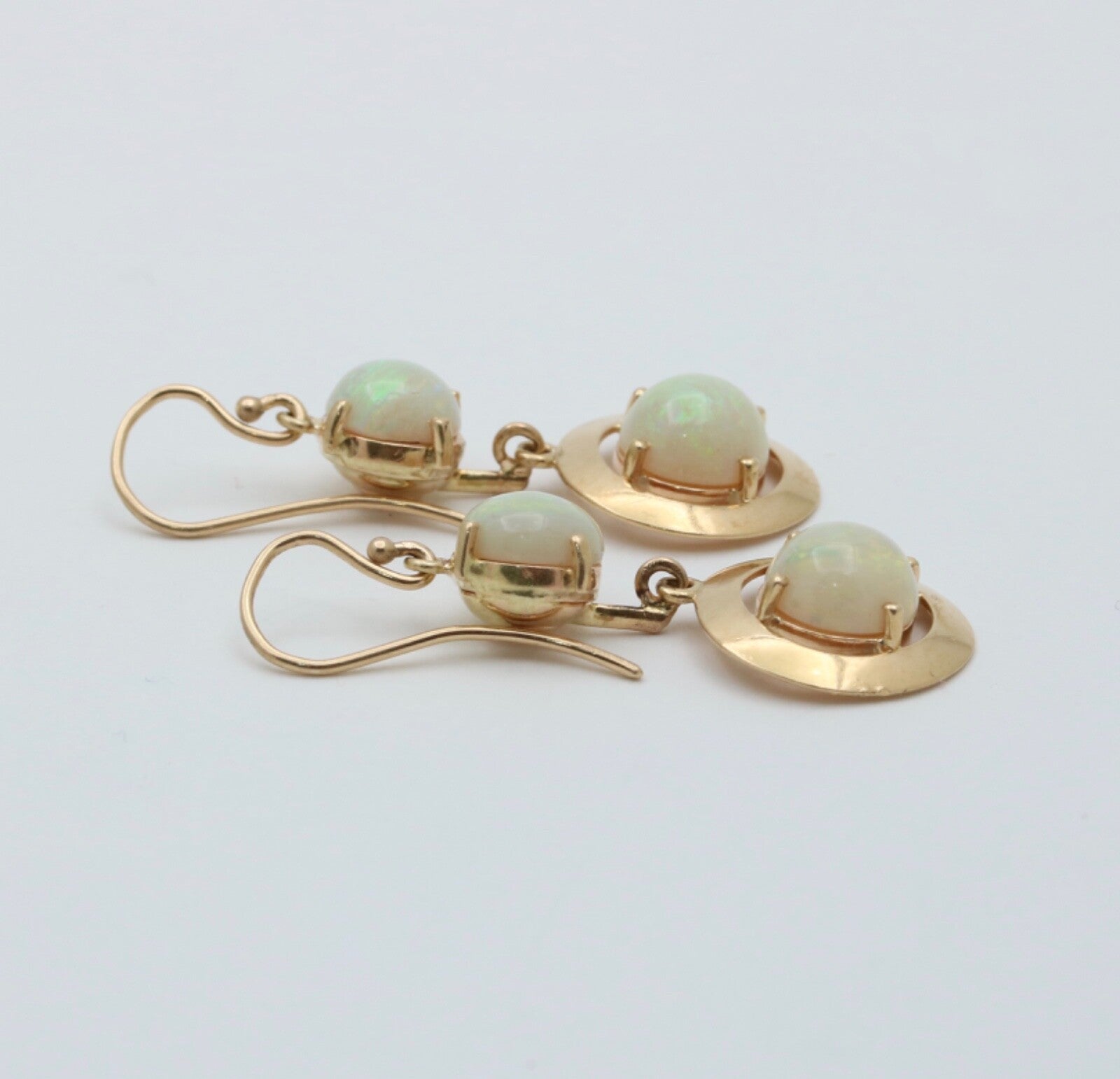 Step back in time with these Vintage 14K Yellow Gold Opal Dangling Earrings! Adorned with milky opals in shades of reddish orange, green, and yellow, these earrings exude a charming 1980's vibe. The disc shape design adds a touch of retro elegance to any outfit, making them a must-have for those who appreciate vintage fashion. Elevate your style and add a nostalgic flair to your look with these stunning opal earrings today! Revive the glamour of the past - snag these Vintage Opal Earrings now!