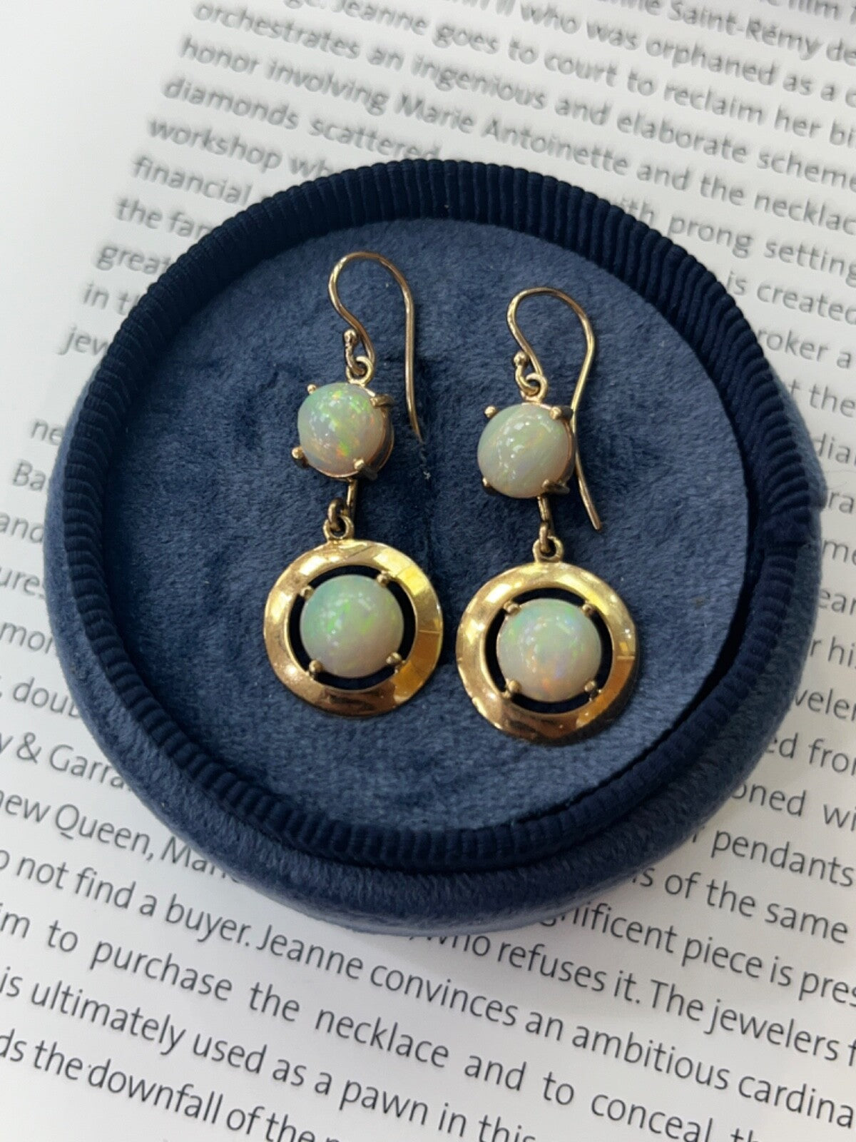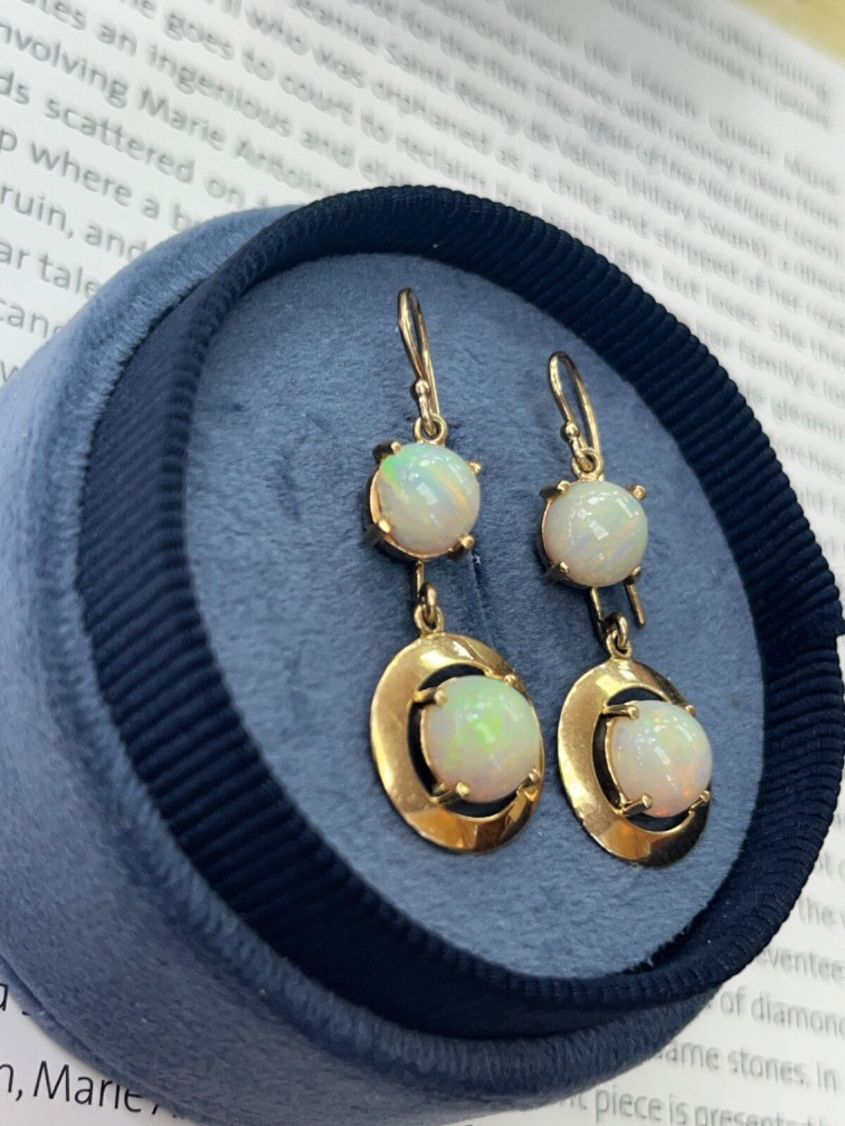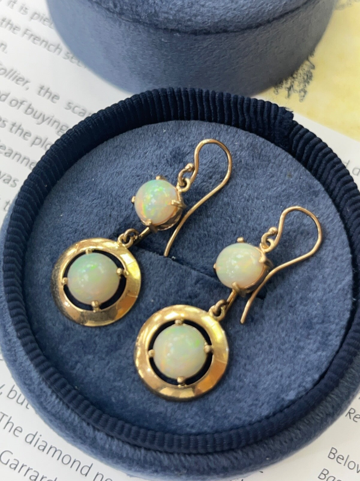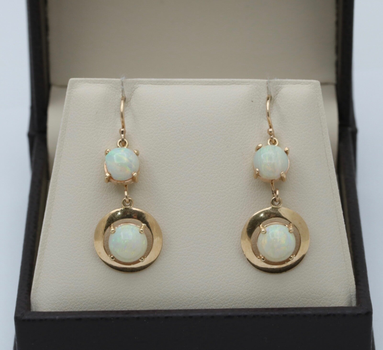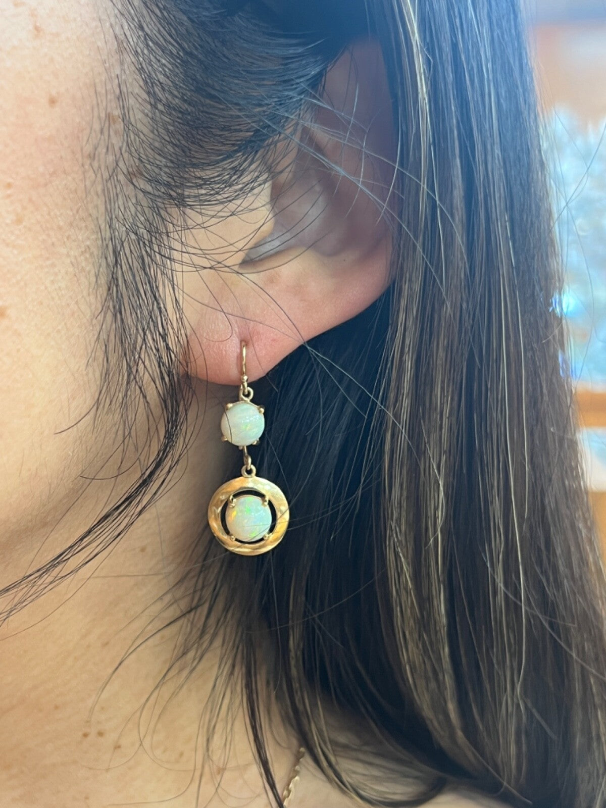 Step back in time with these Vintage 14K Yellow Gold Opal Dangling Earrings! Adorned with milky opals in shades of reddish orange, green, and yellow, these earrings exude a charming 1980's vibe. The disc shape design adds a touch of retro elegance to any outfit, making them a must-have for those who appreciate vintage fashion. Elevate your style and add a nostalgic flair to your look with these stunning opal earrings today! Revive the glamour of the past - snag these Vintage Opal Earrings now!