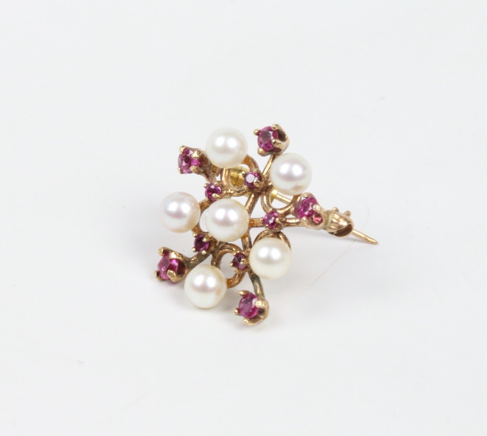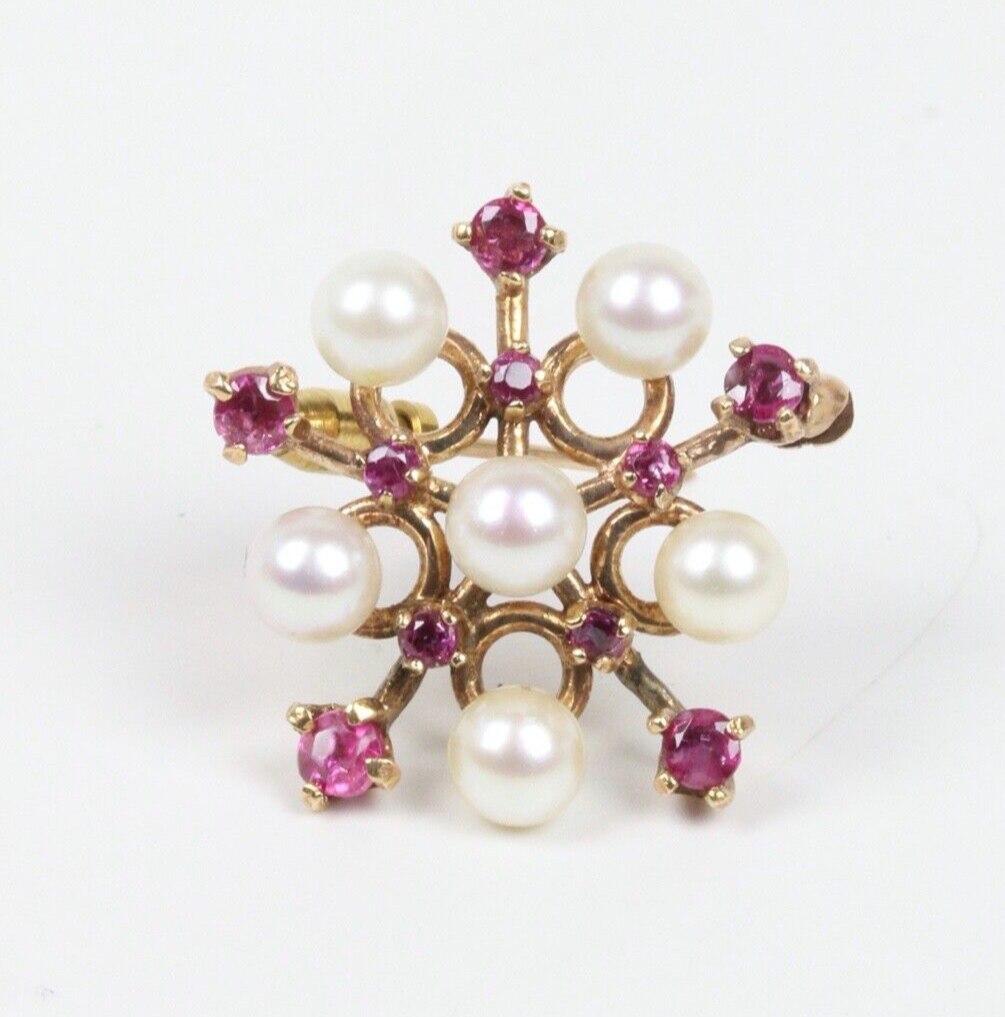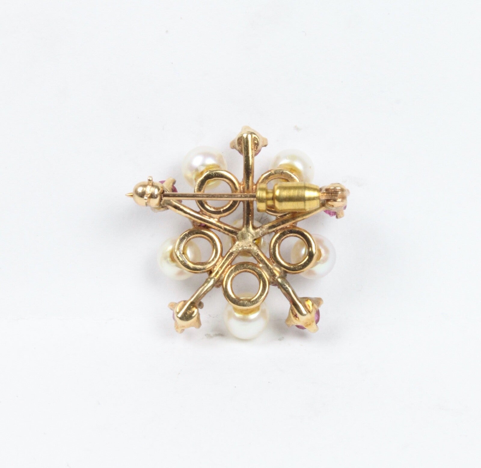 Beautiful Vintage Brooch Pin. A Star shape design in 14K Yellow Gold. Lots of Pearls and Rubies set into a five point pattern. Circles and bars hold the entire piece together. All the colors make any article of clothing look great! Great for a lapel, scarf or hat!