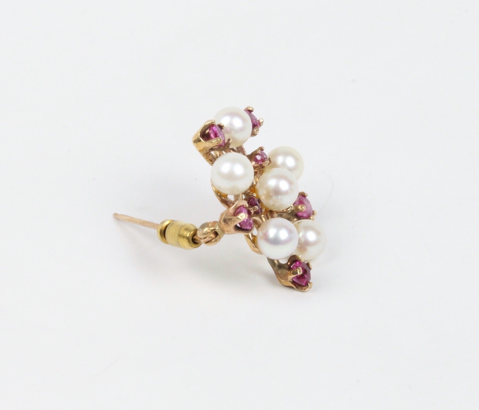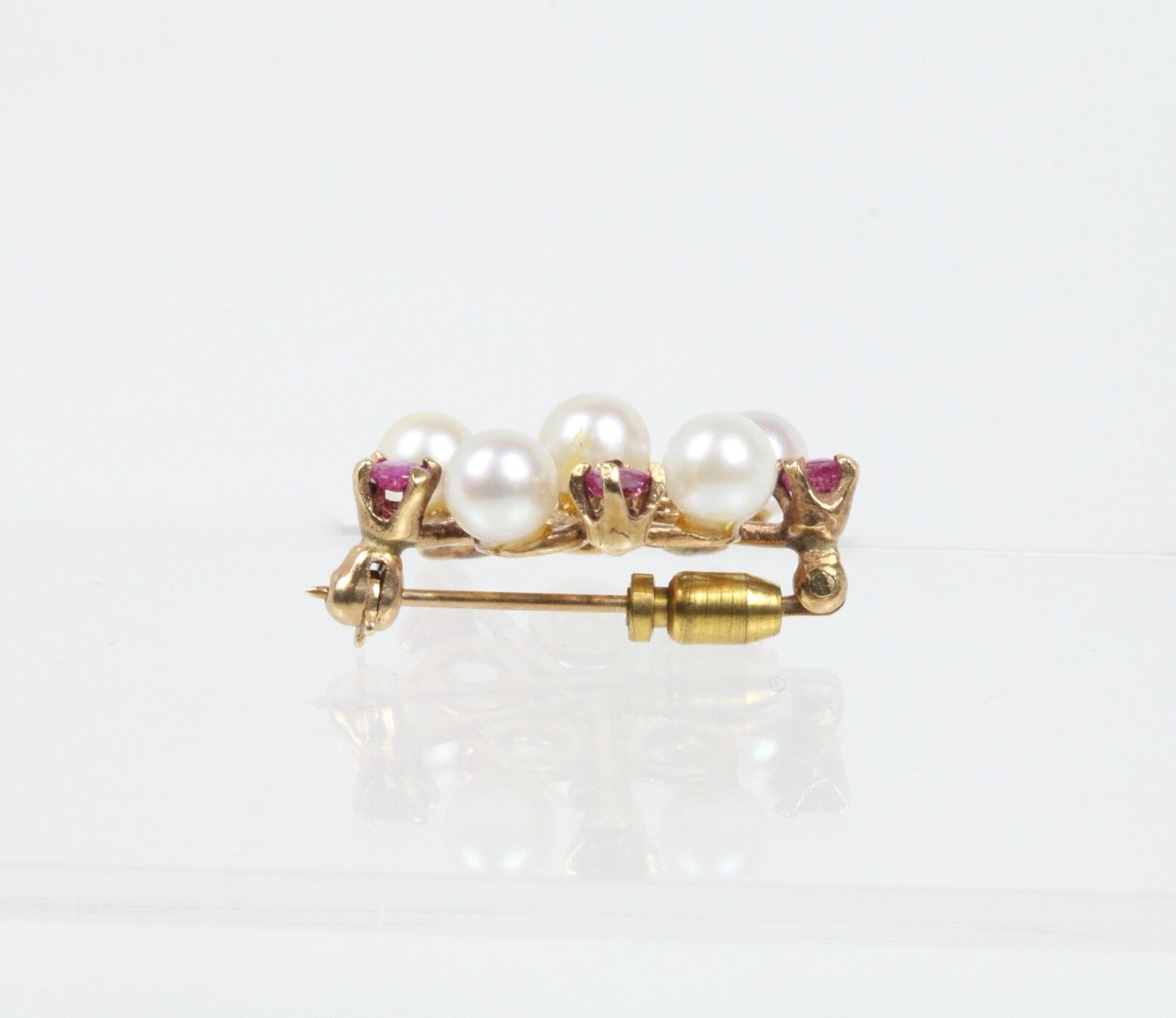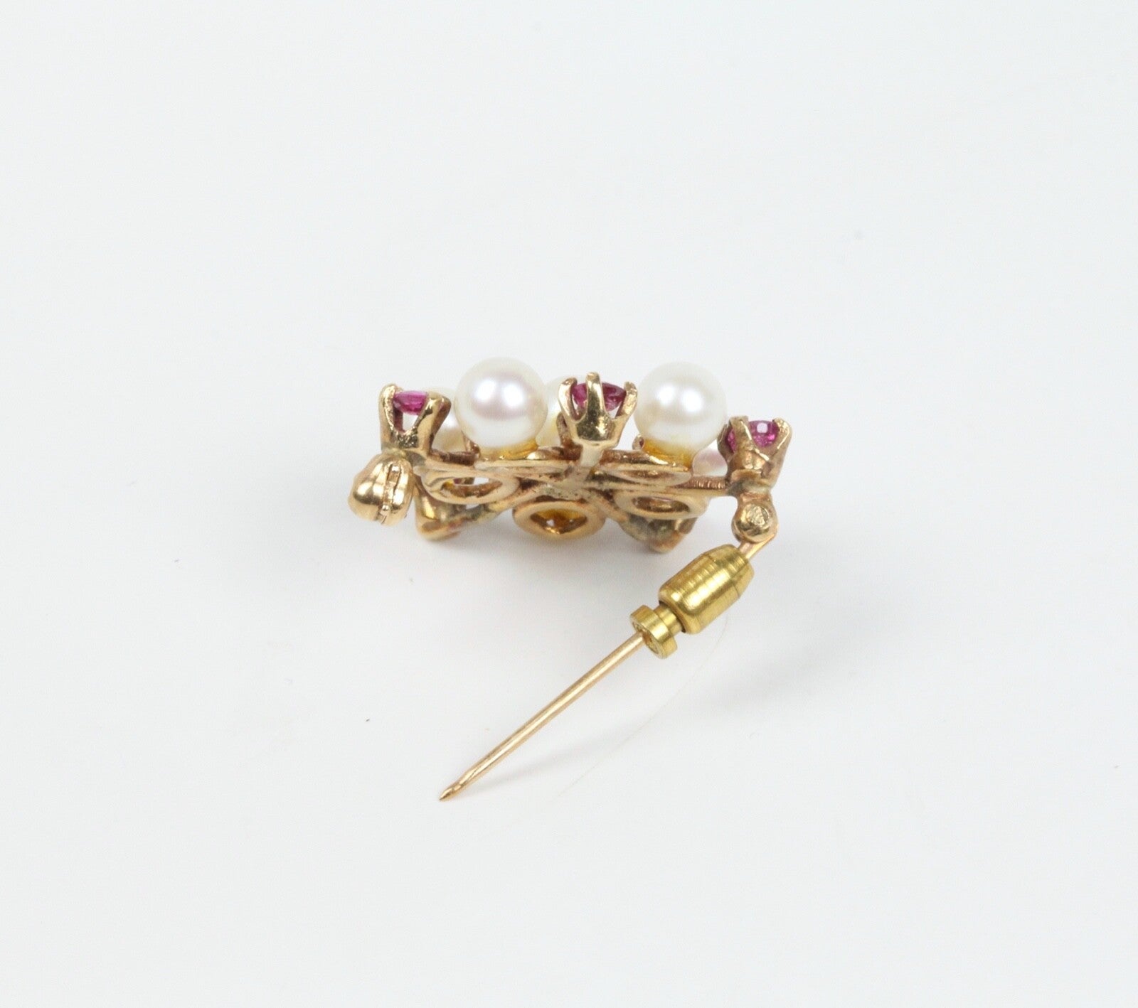 Beautiful Vintage Brooch Pin. A Star shape design in 14K Yellow Gold. Lots of Pearls and Rubies set into a five point pattern. Circles and bars hold the entire piece together. All the colors make any article of clothing look great! Great for a lapel, scarf or hat!