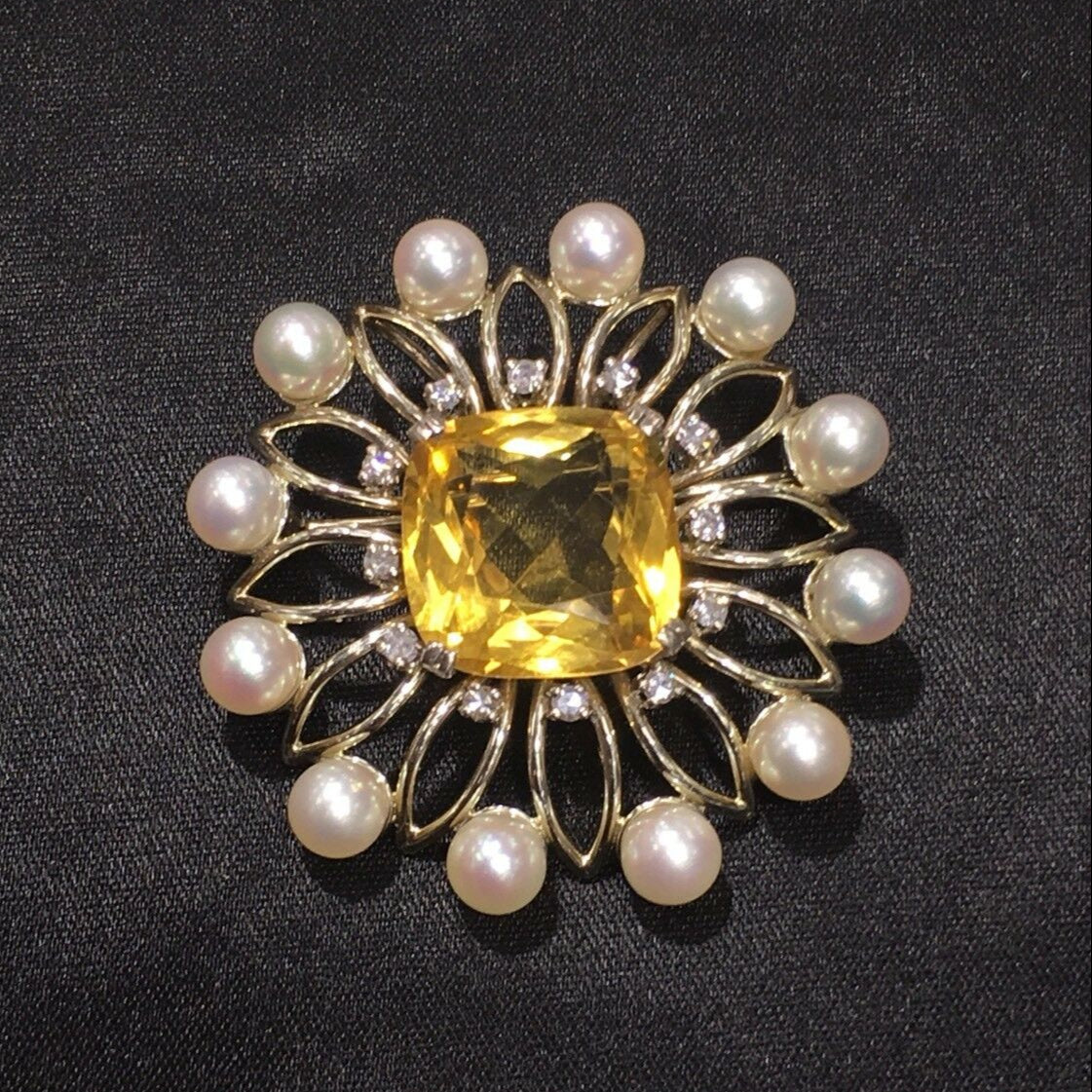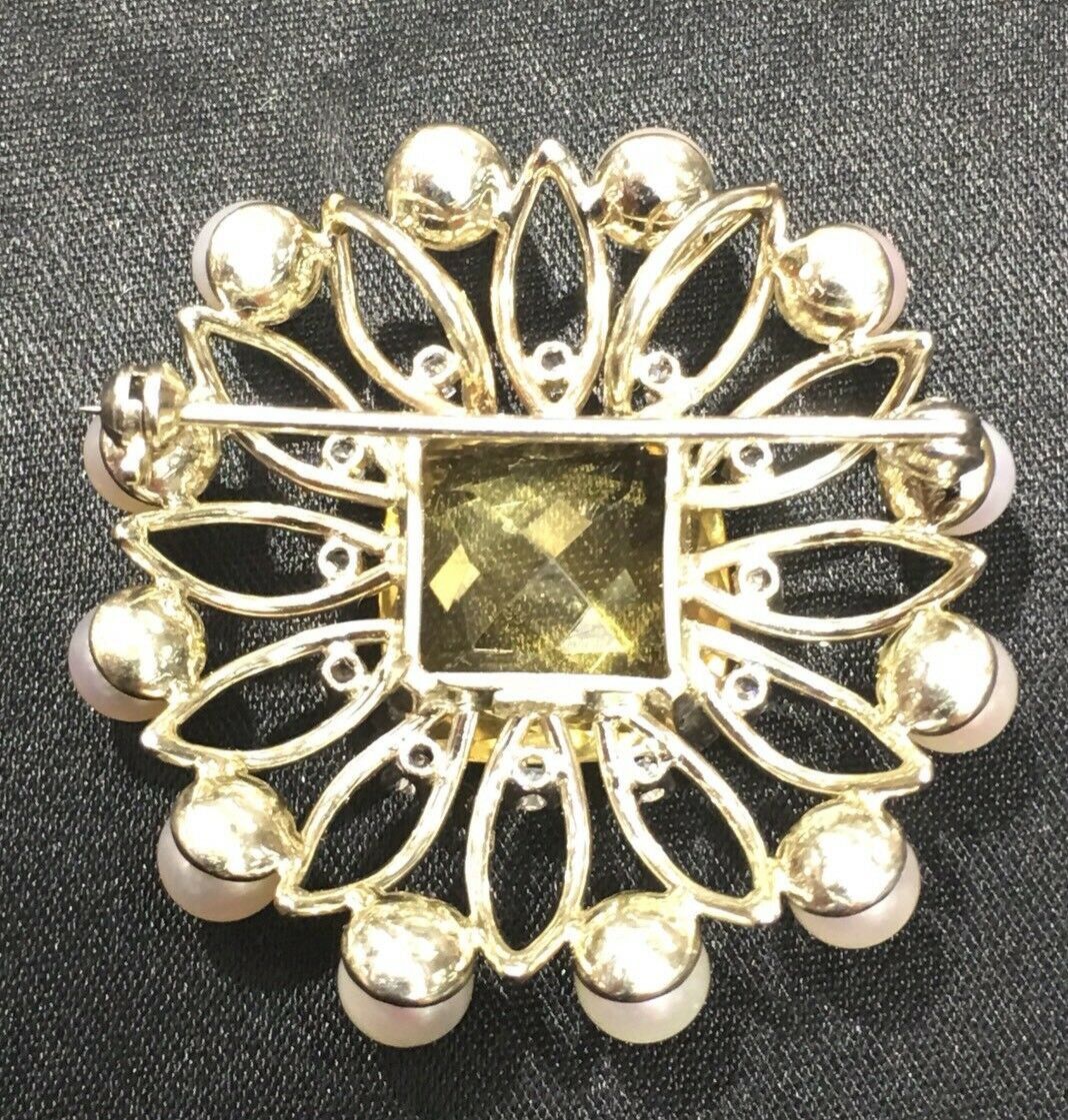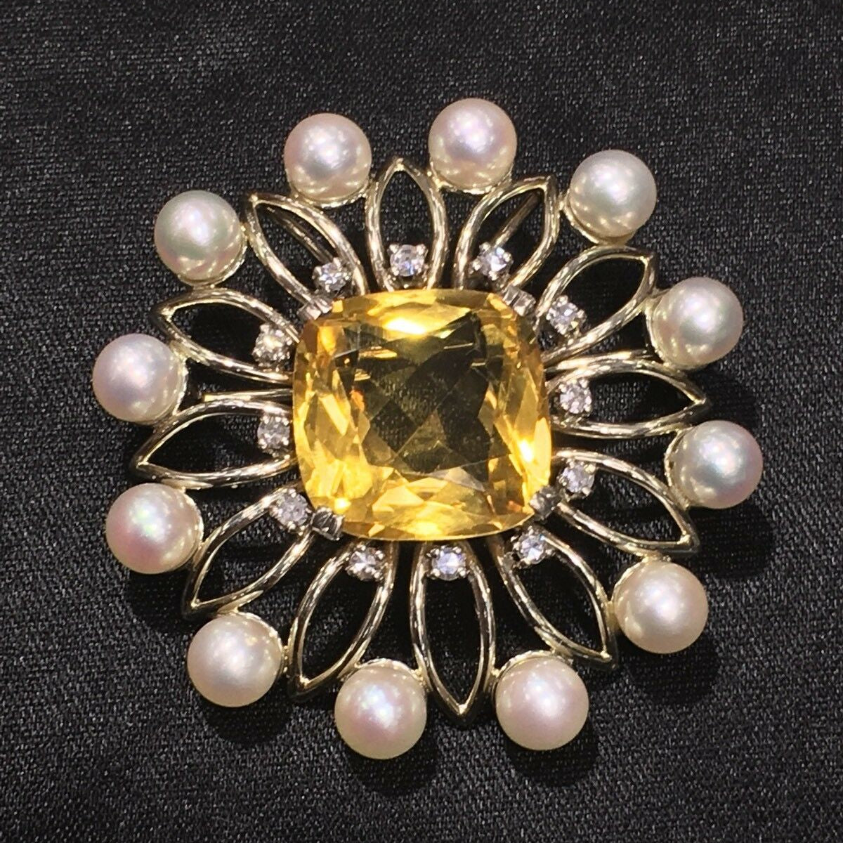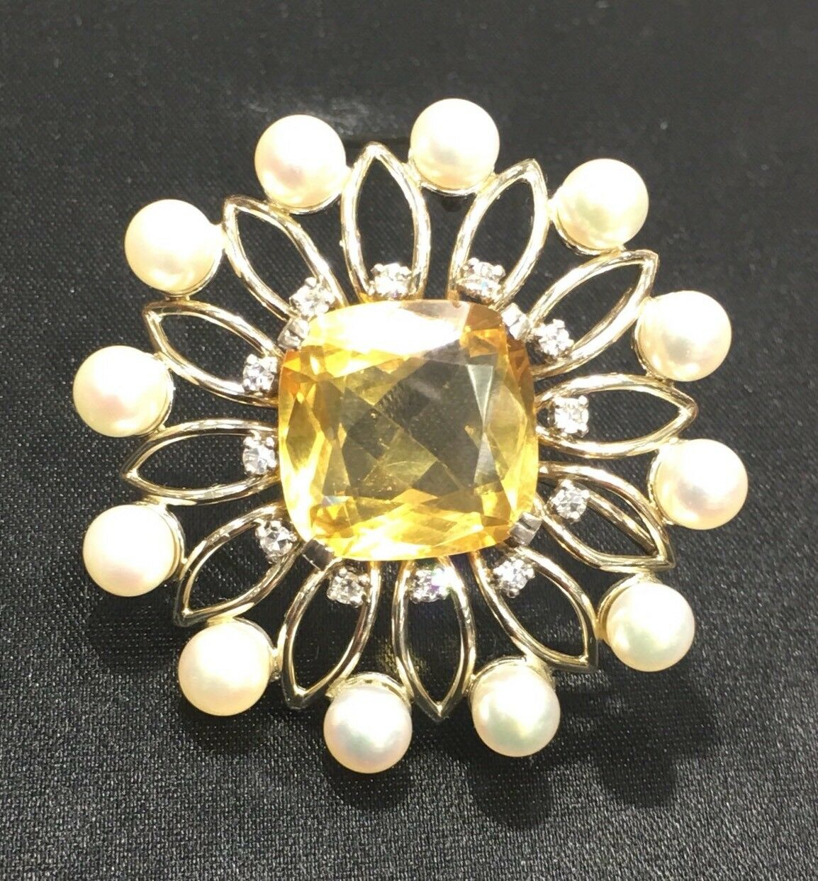 A radiant vintage brooch featuring a large, natural citrine set in an intricate white gold frame. Surrounding the golden-hued gemstone are beautifully cut diamonds, adding sparkle and contrast. The perimeter is finished with luminous White South Sea pearls, creating an elegant and timeless design. This striking piece complements any outfit and suits all skin tones, making it a versatile addition to any jewelry collection.