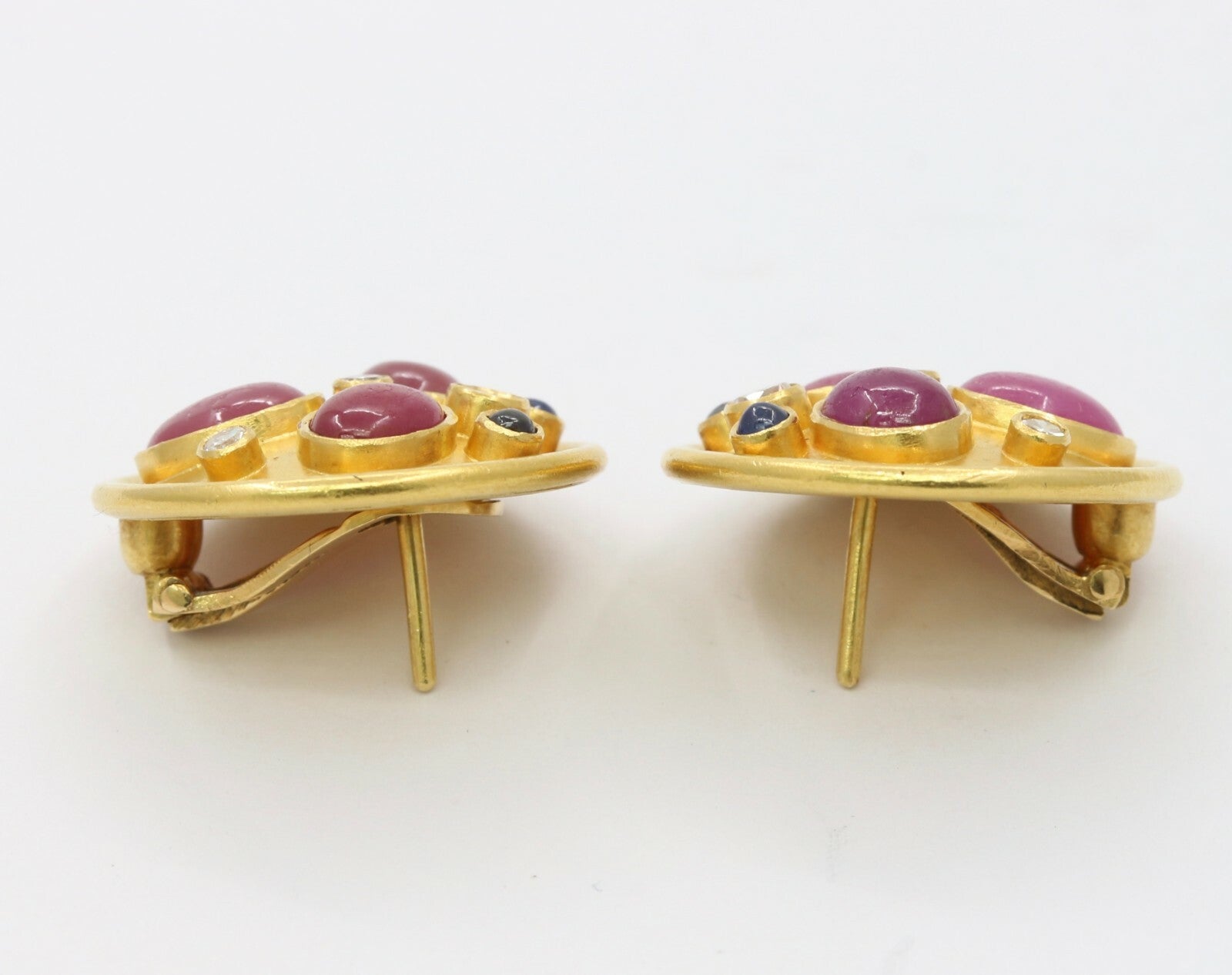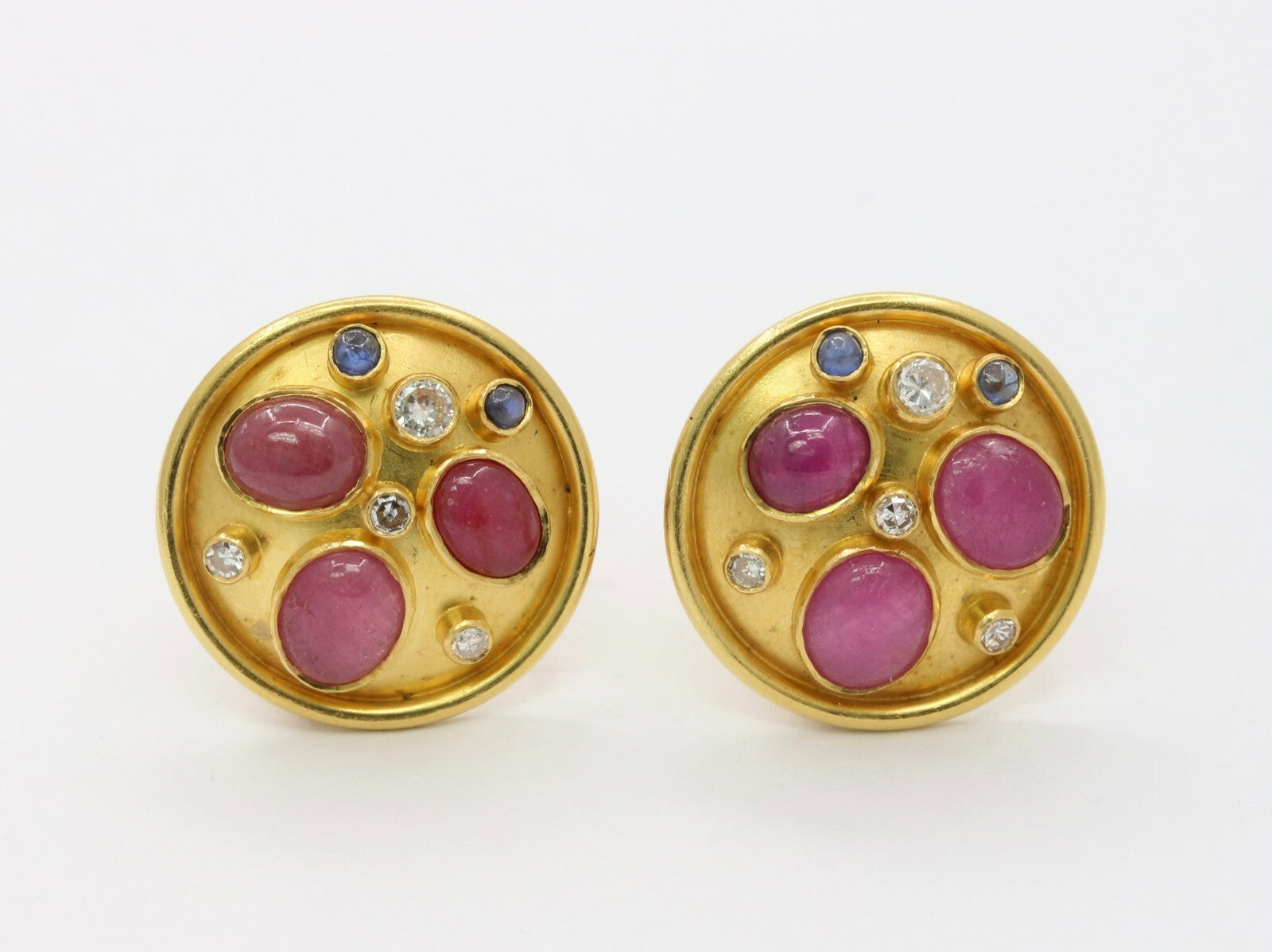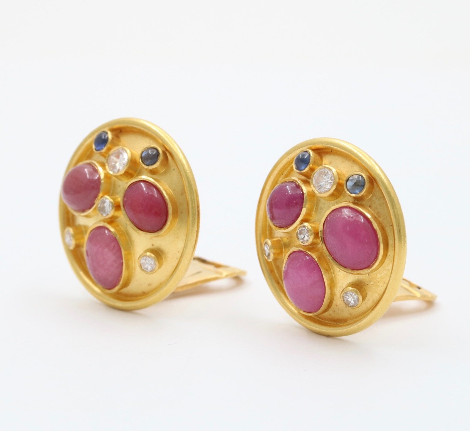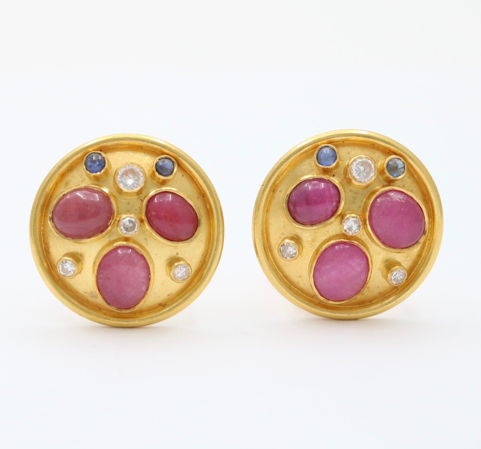 These are a beautiful pair of circular earrings that have been embedded with rubies sapphires and diamonds. These earrings when worn are the perfect size and with its unique stone setting pattern, these will be sure to catch everyones attention. The stones are set perfectly in a fun and unique pattern that highlights each of the stones and with the high karat of gold background, the stones truly shine. Get these wonderful earrings today and wear them for your next event and show off these stunners.