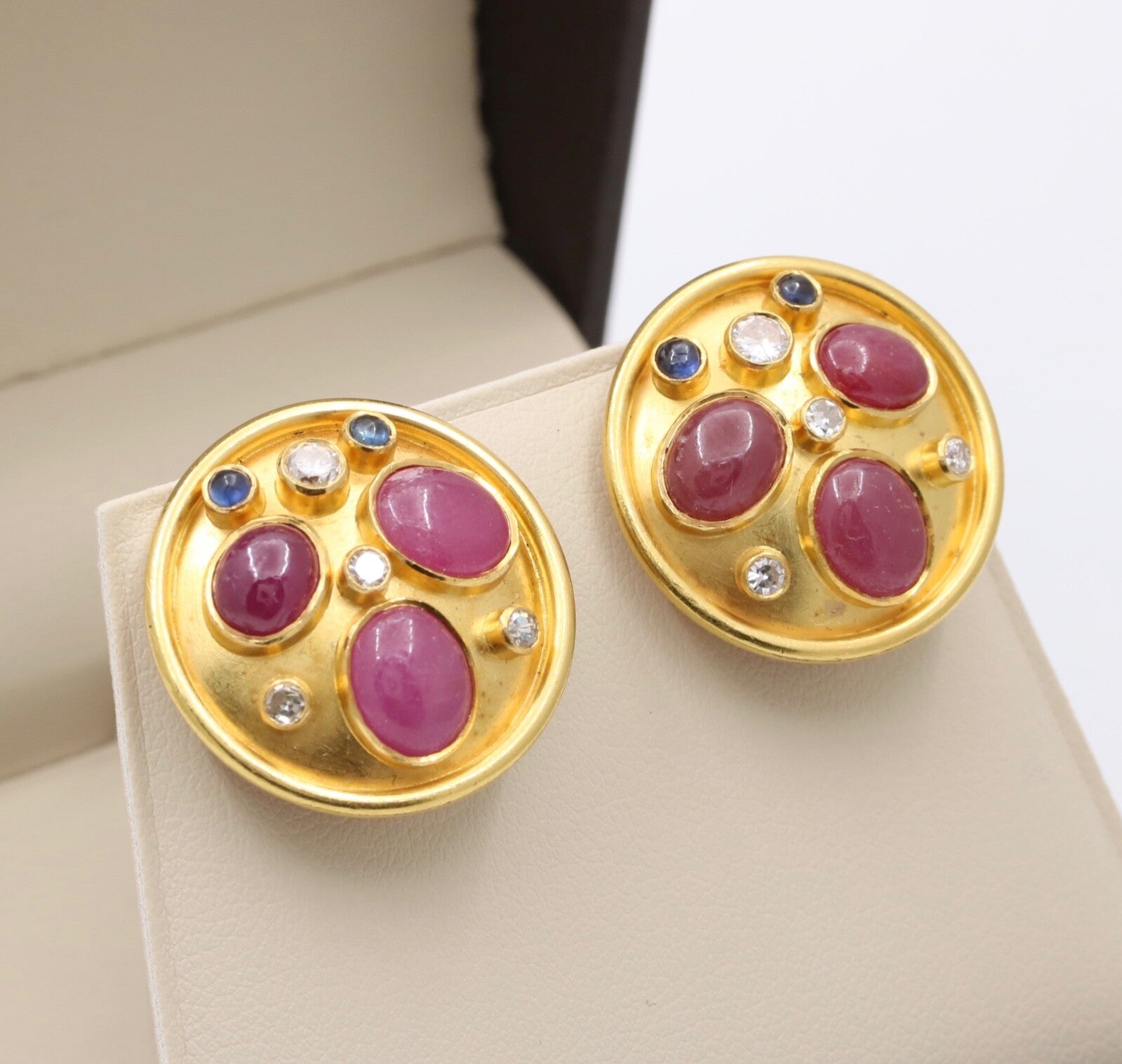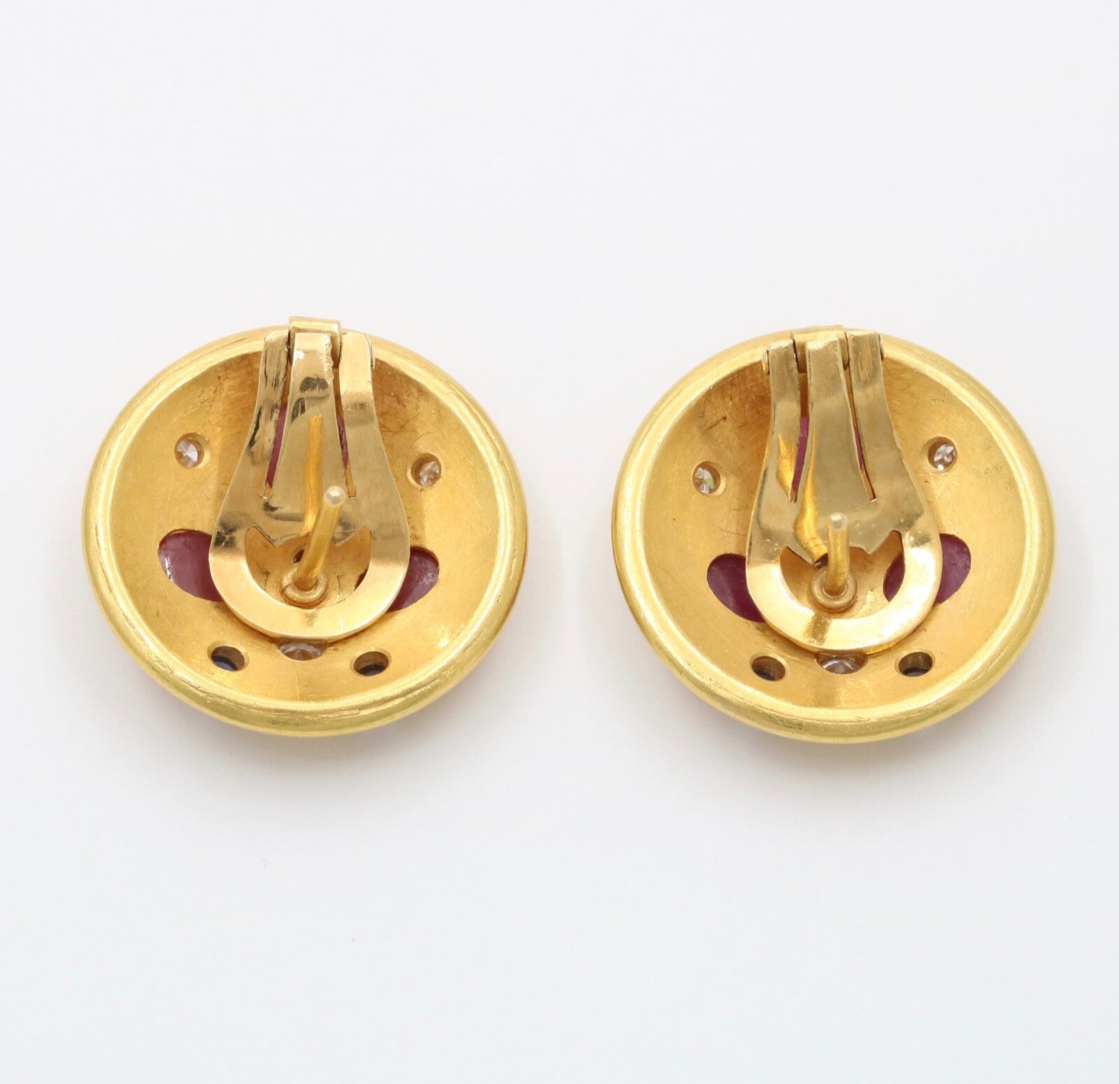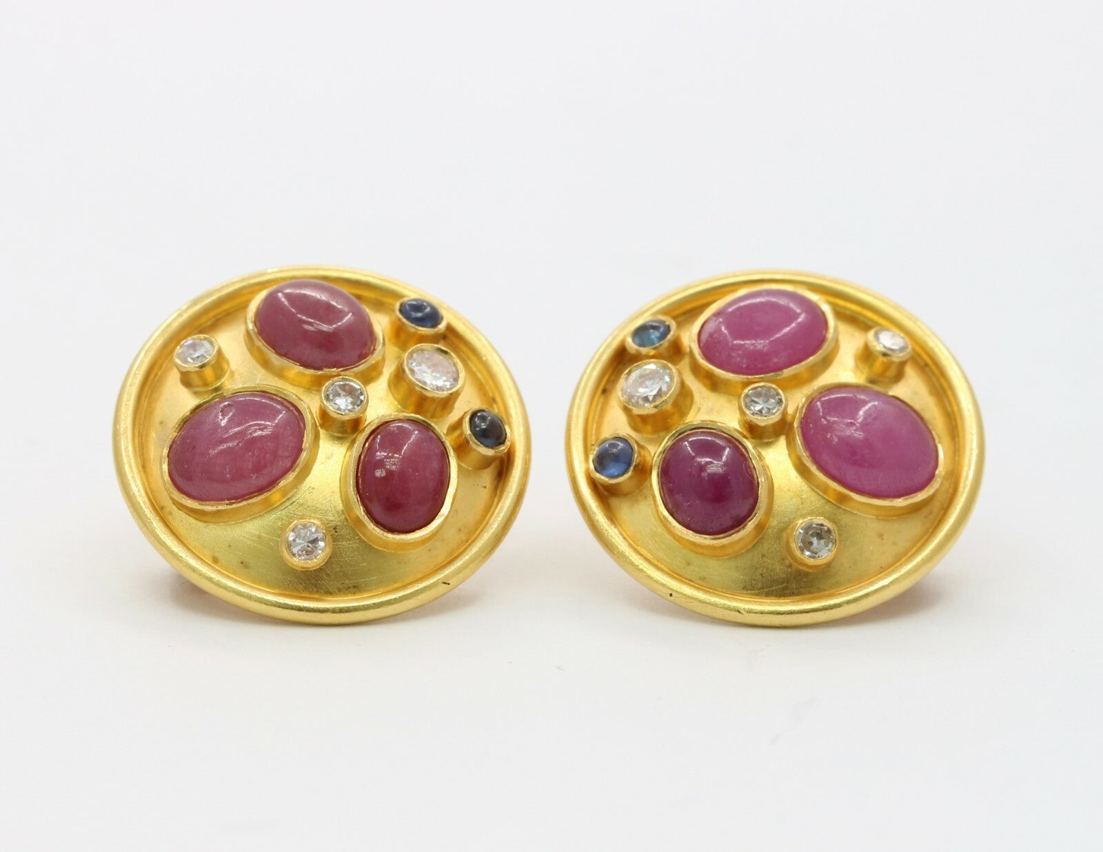 These are a beautiful pair of circular earrings that have been embedded with rubies sapphires and diamonds. These earrings when worn are the perfect size and with its unique stone setting pattern, these will be sure to catch everyones attention. The stones are set perfectly in a fun and unique pattern that highlights each of the stones and with the high karat of gold background, the stones truly shine. Get these wonderful earrings today and wear them for your next event and show off these stunners.