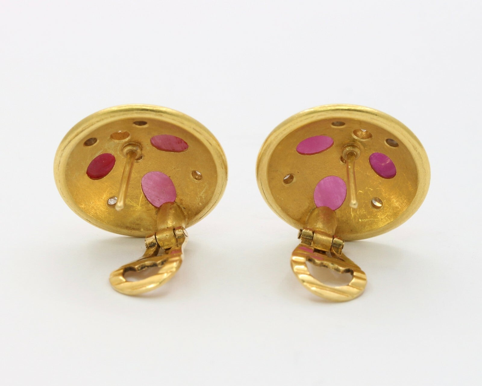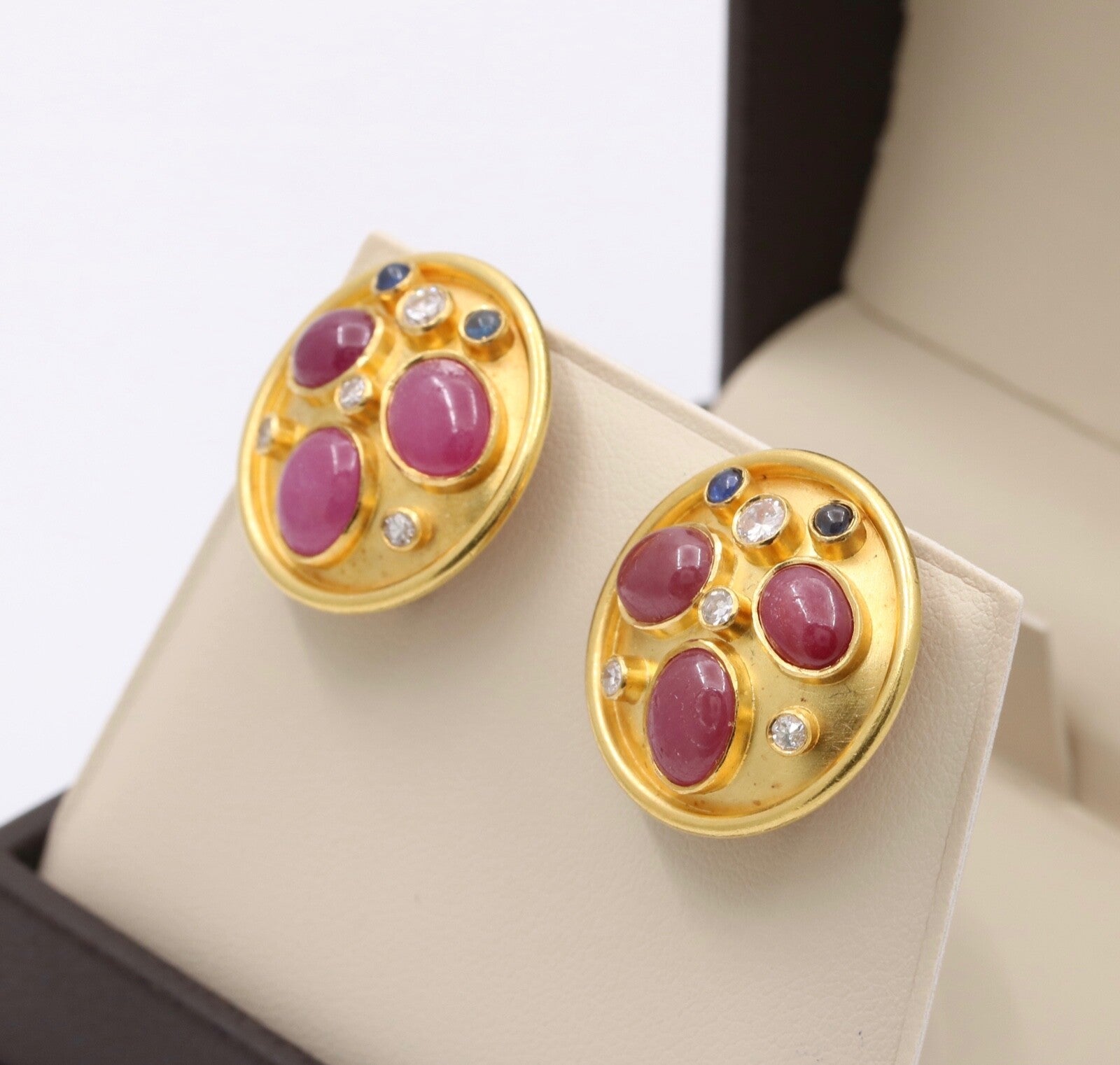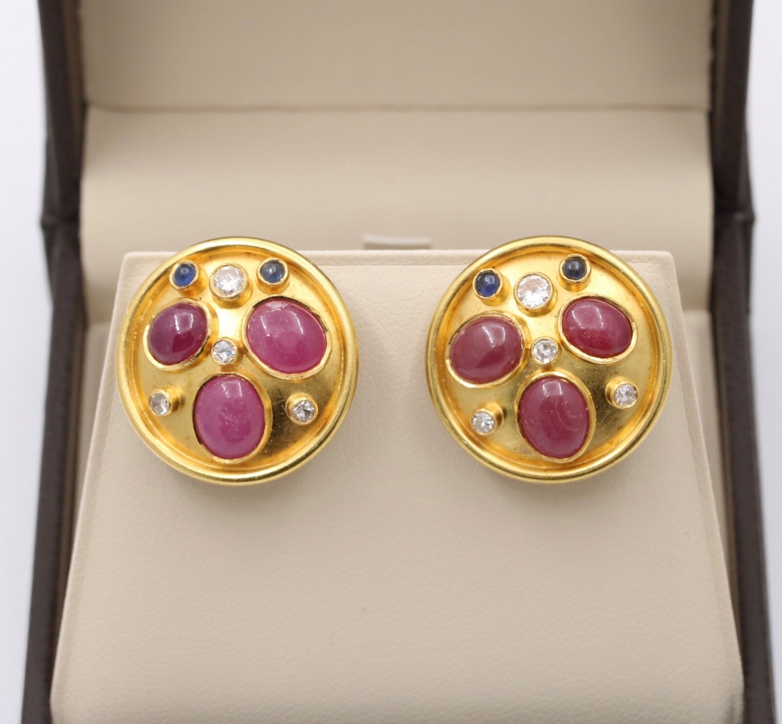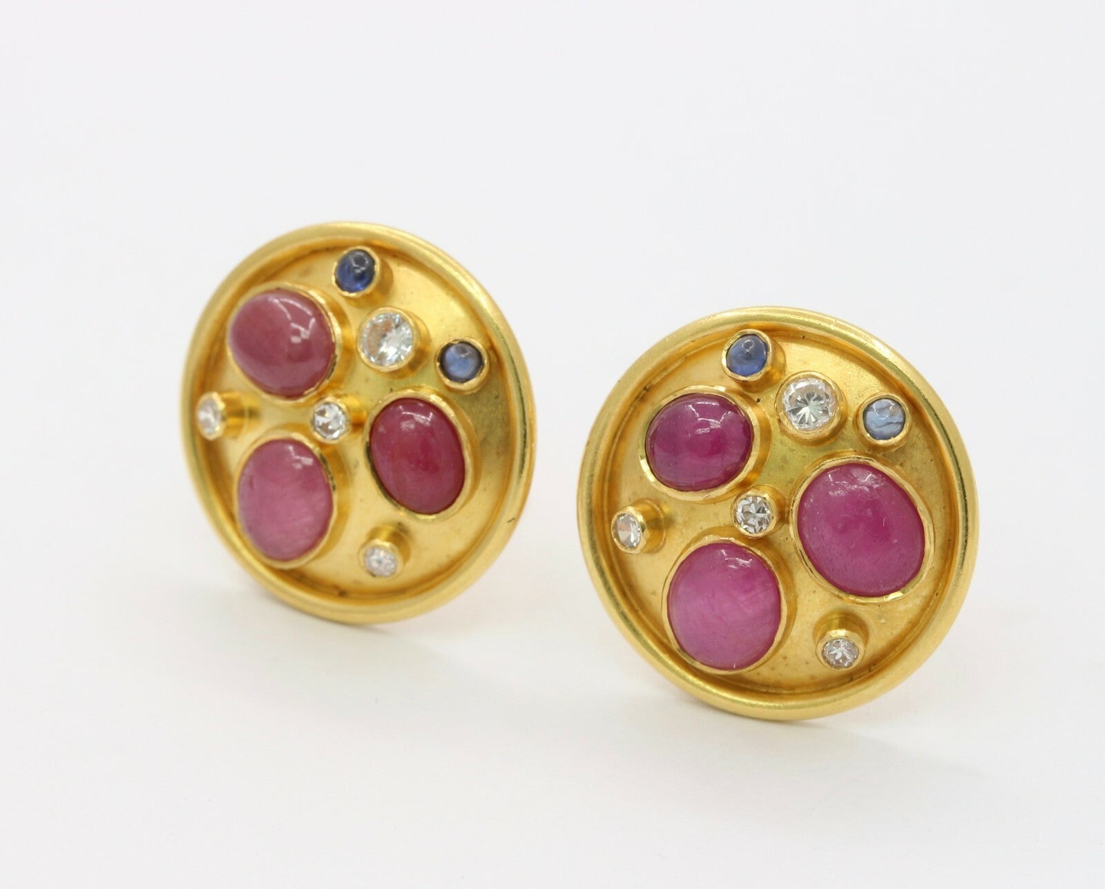 These are a beautiful pair of circular earrings that have been embedded with rubies sapphires and diamonds. These earrings when worn are the perfect size and with its unique stone setting pattern, these will be sure to catch everyones attention. The stones are set perfectly in a fun and unique pattern that highlights each of the stones and with the high karat of gold background, the stones truly shine. Get these wonderful earrings today and wear them for your next event and show off these stunners.