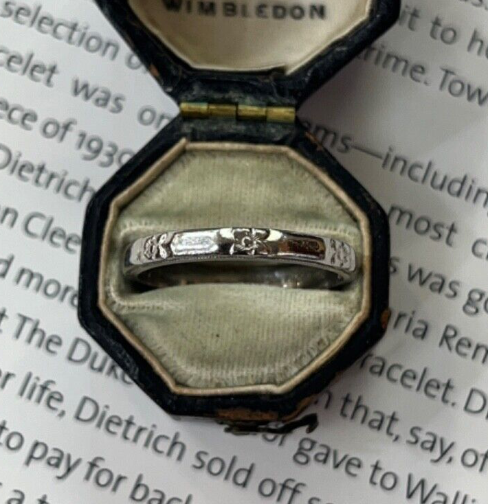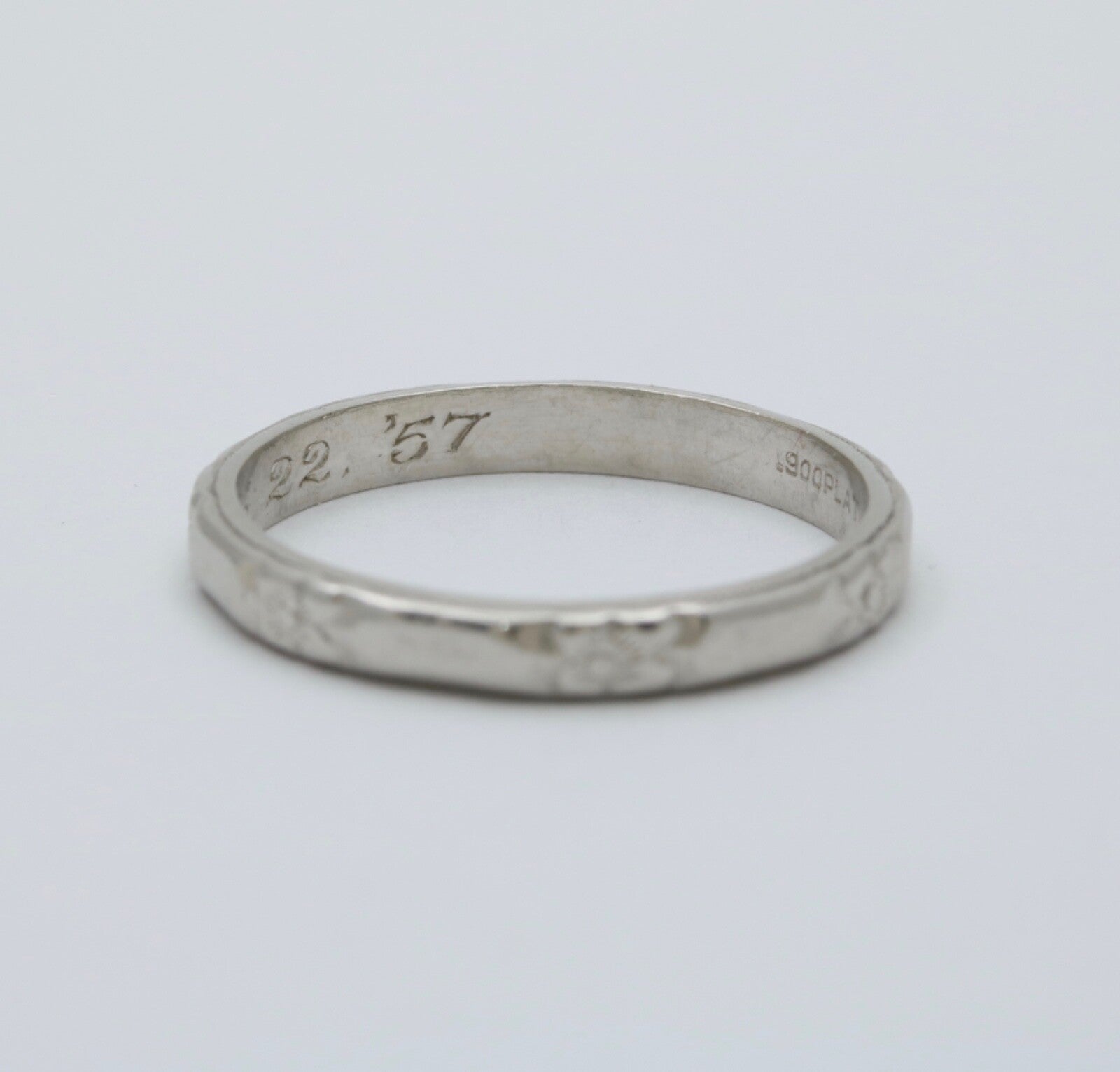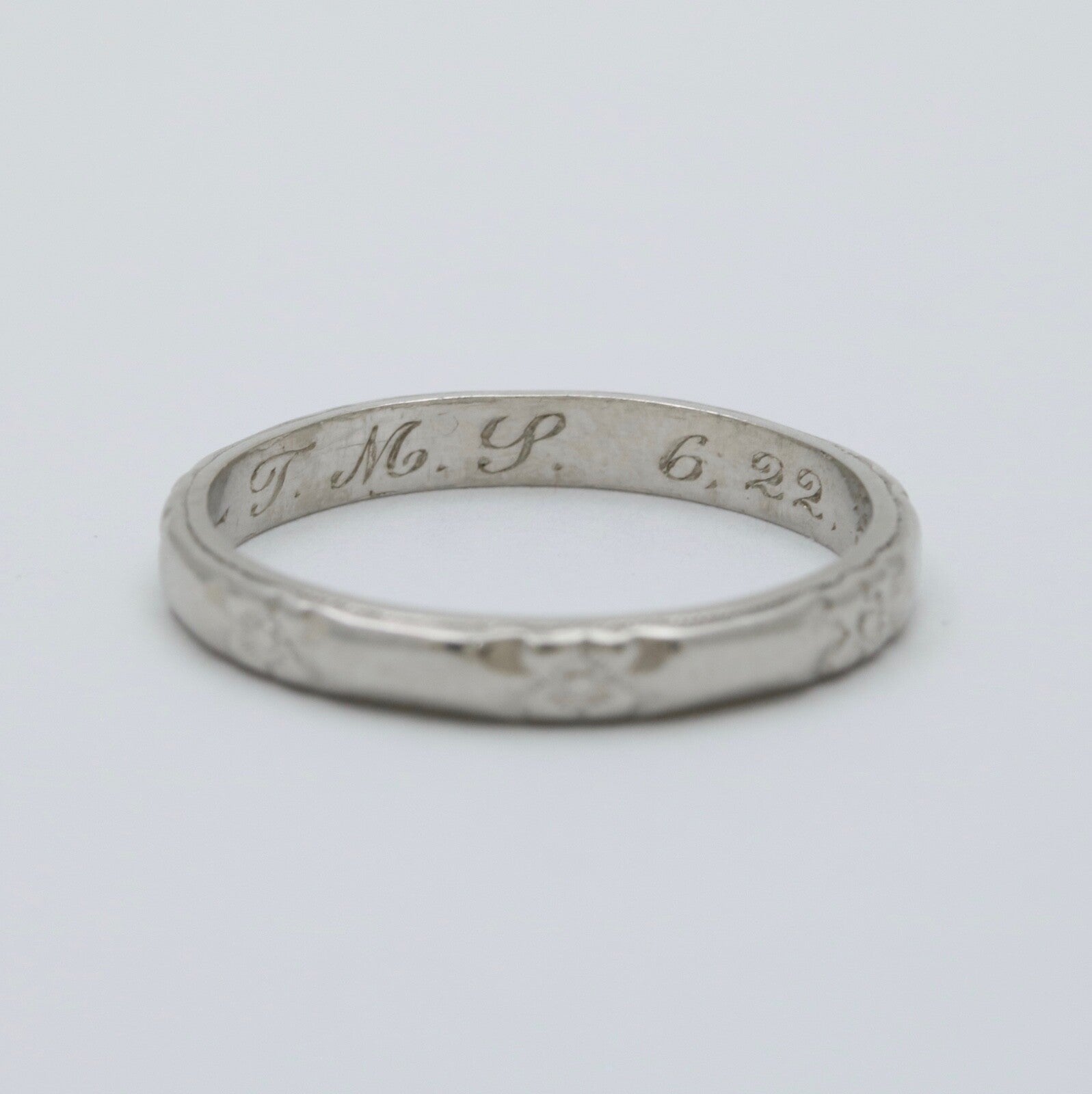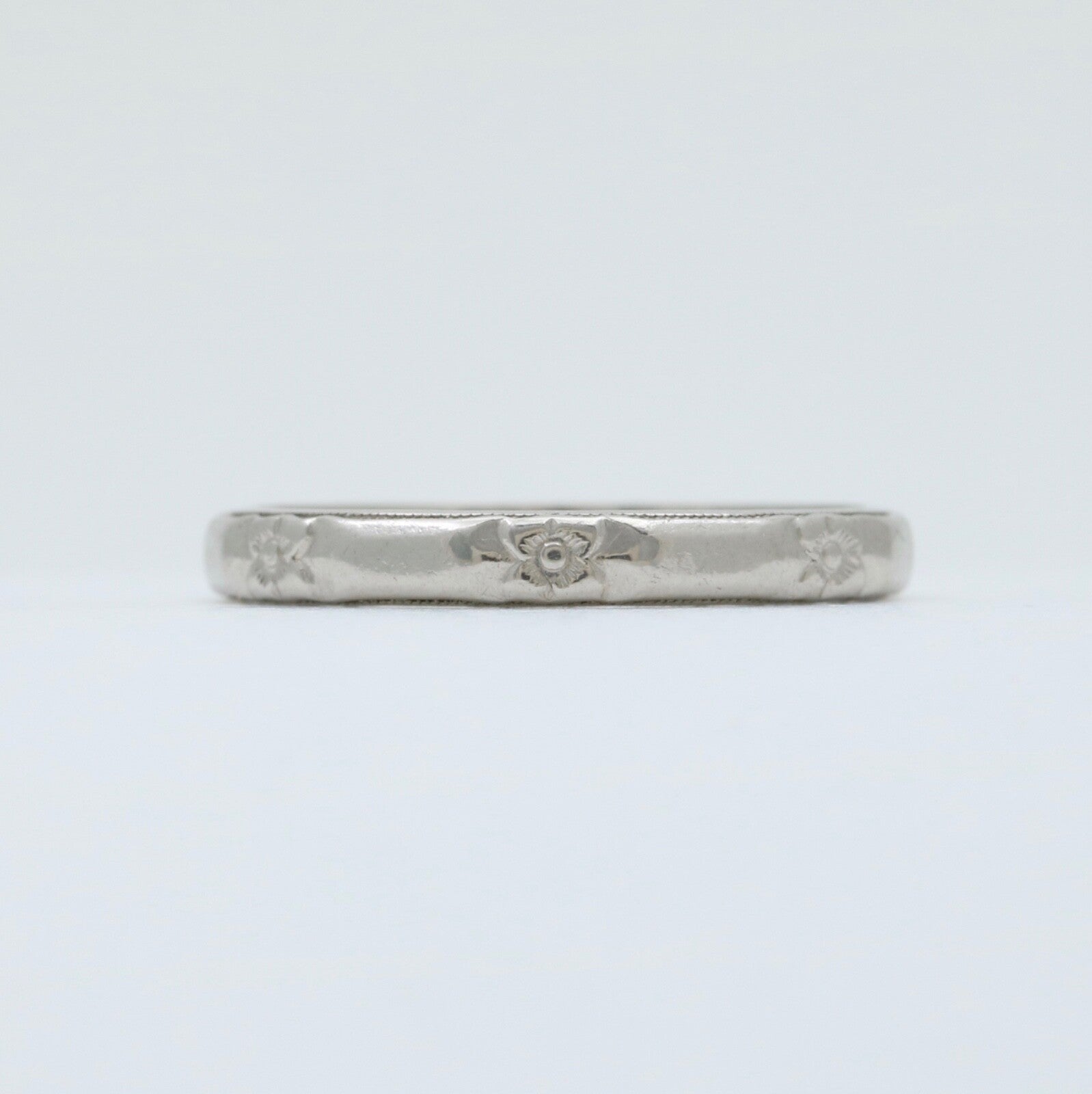 This stunning vintage wedding band is expertly crafted in platinum, featuring intricate orange blossom engravings that encircle the entire ring. Perfect for those who appreciate timeless elegance and exquisite detailing, this band beautifully captures the essence of vintage charm