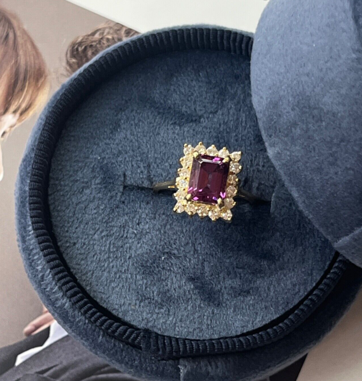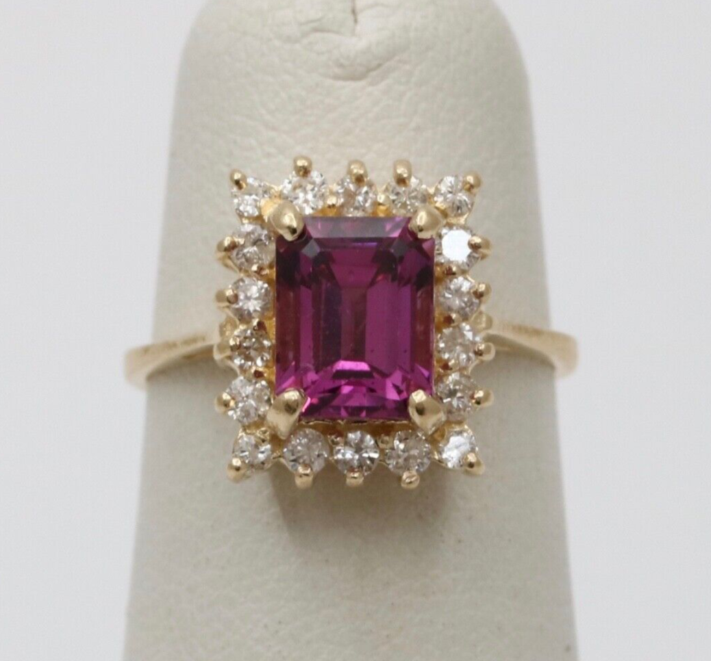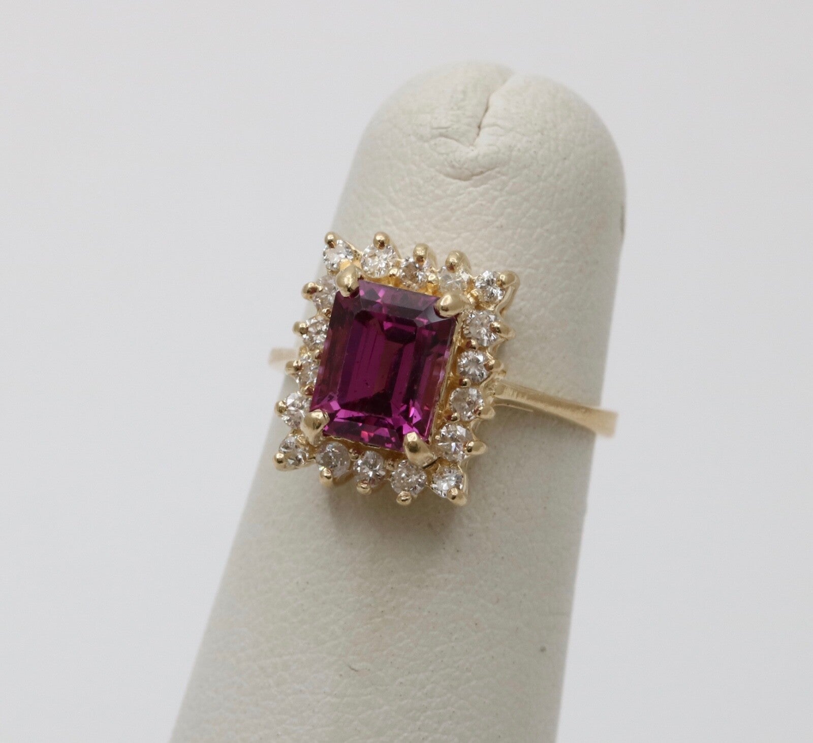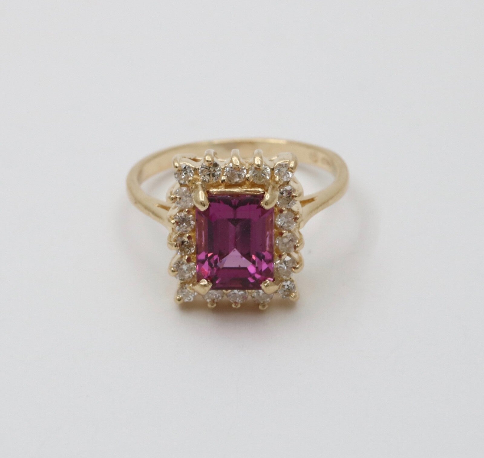 Fall in love with this stunning ring that will make your heart skip a beat. Featuring an eye-catching deep pink rhodolite garnet, this gorgeous 14K yellow gold ring surrounds the center gem with a dazzling halo of diamonds that sparkle with every move. The rich pink hue of the rhodolite garnet stands out beautifully against the warm yellow gold, creating a look that is both romantic and sophisticated. With its brilliant diamonds and vibrant center stone, this ring makes a statement. Slip it on your finger to add an elegant pop of color and shine to any outfit. This head-turning piece is sure to capture compliments and hearts wherever you go. Make it yours today!