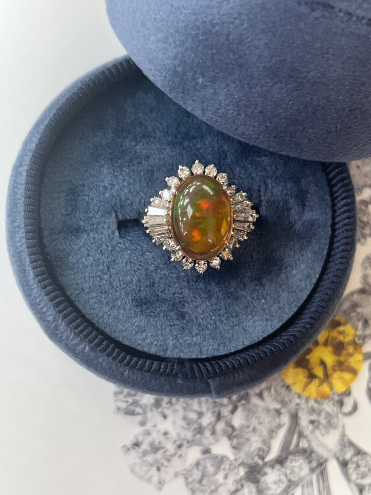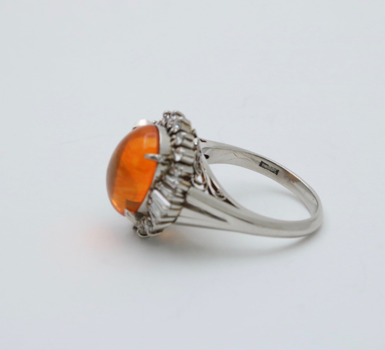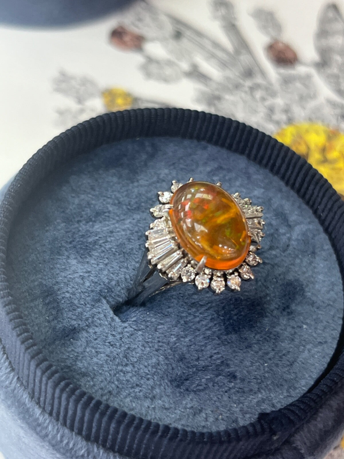 A fiery blaze of color and light, this vintage platinum ring is a true statement piece. Vintage Platinum Fire Opal Diamond Ring. This statement-making ring is designed to turn heads and spark conversation with its exquisite center fire opal, radiating iridescent rainbow hues. The dazzling diamonds encircling the band add luxurious brilliance, including baguette cut stones on the sides and brilliant cuts top and below for maximum visual impact. Slip on this vintage-inspired stunner for your next special occasion or night out and get ready to field compliments! This standout ring makes a showstopping addition to any jewelry collection.