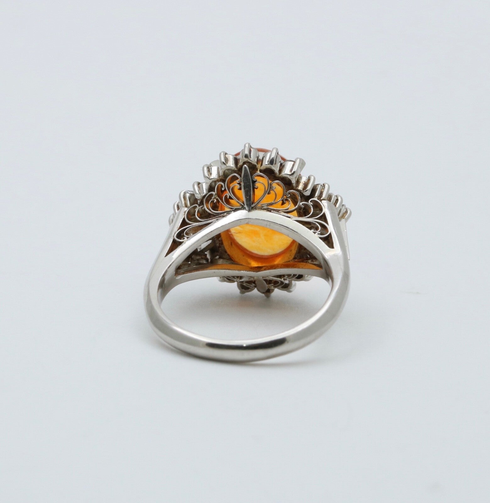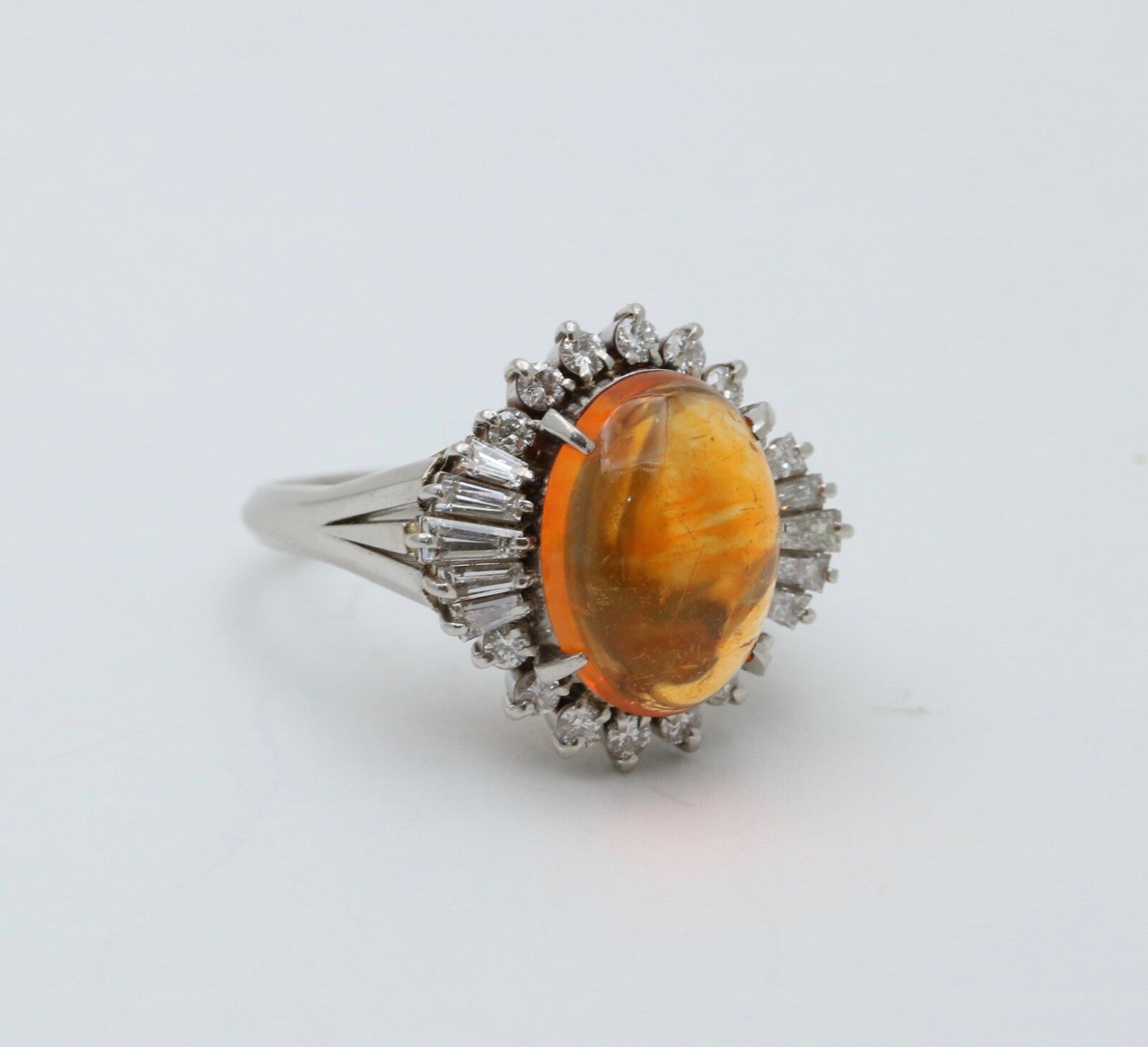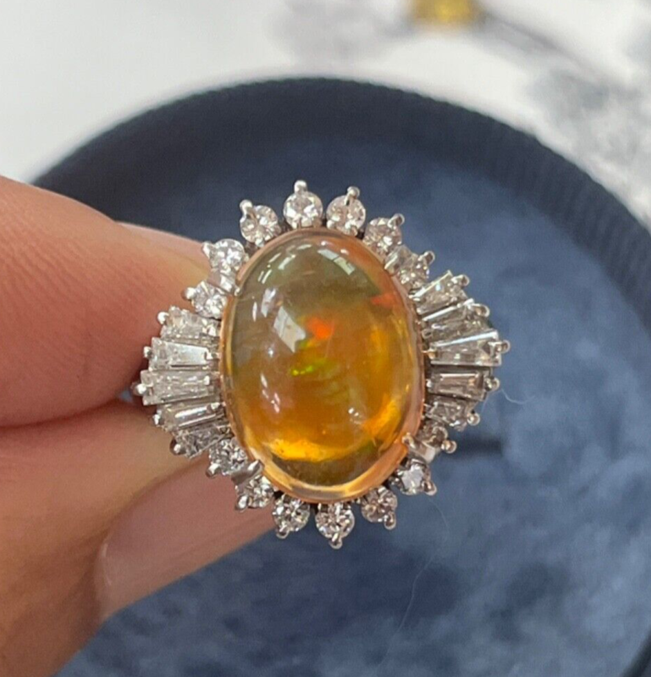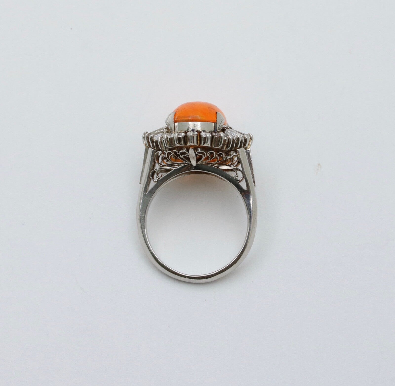 A fiery blaze of color and light, this vintage platinum ring is a true statement piece. Vintage Platinum Fire Opal Diamond Ring. This statement-making ring is designed to turn heads and spark conversation with its exquisite center fire opal, radiating iridescent rainbow hues. The dazzling diamonds encircling the band add luxurious brilliance, including baguette cut stones on the sides and brilliant cuts top and below for maximum visual impact. Slip on this vintage-inspired stunner for your next special occasion or night out and get ready to field compliments! This standout ring makes a showstopping addition to any jewelry collection.