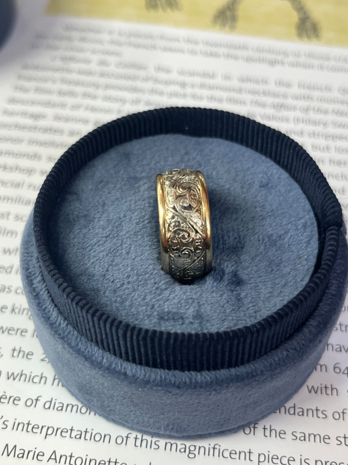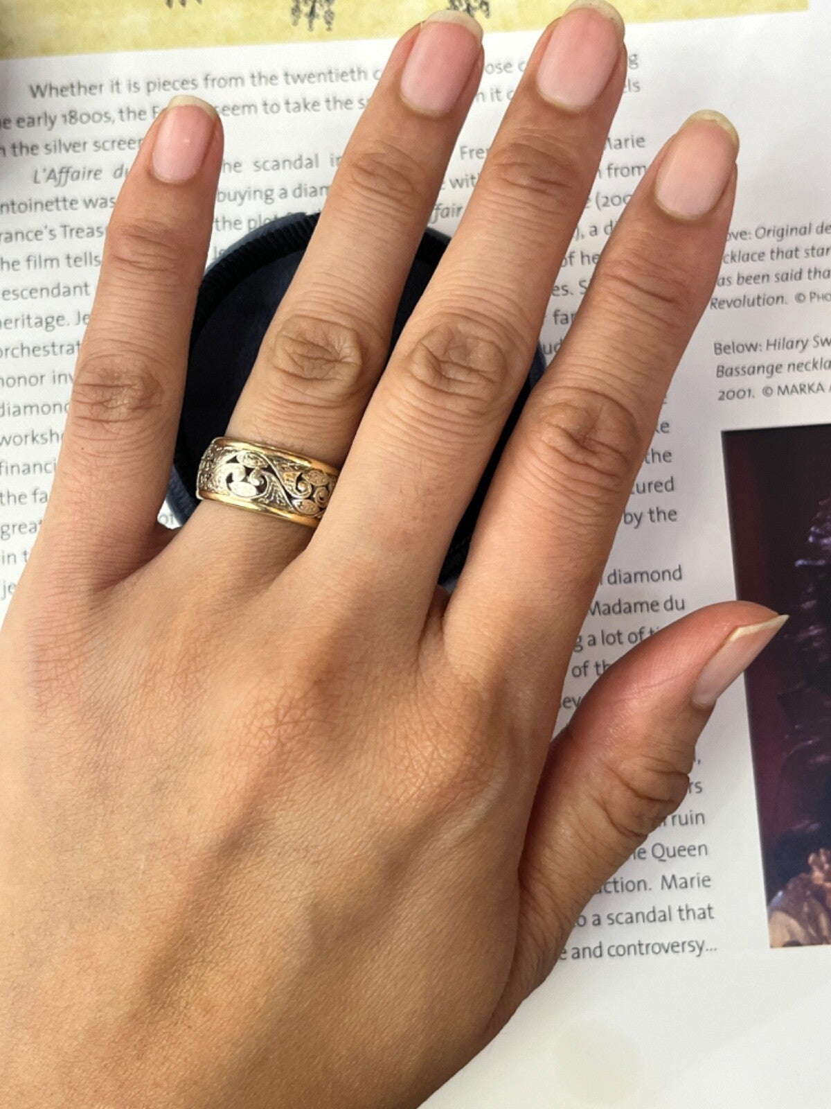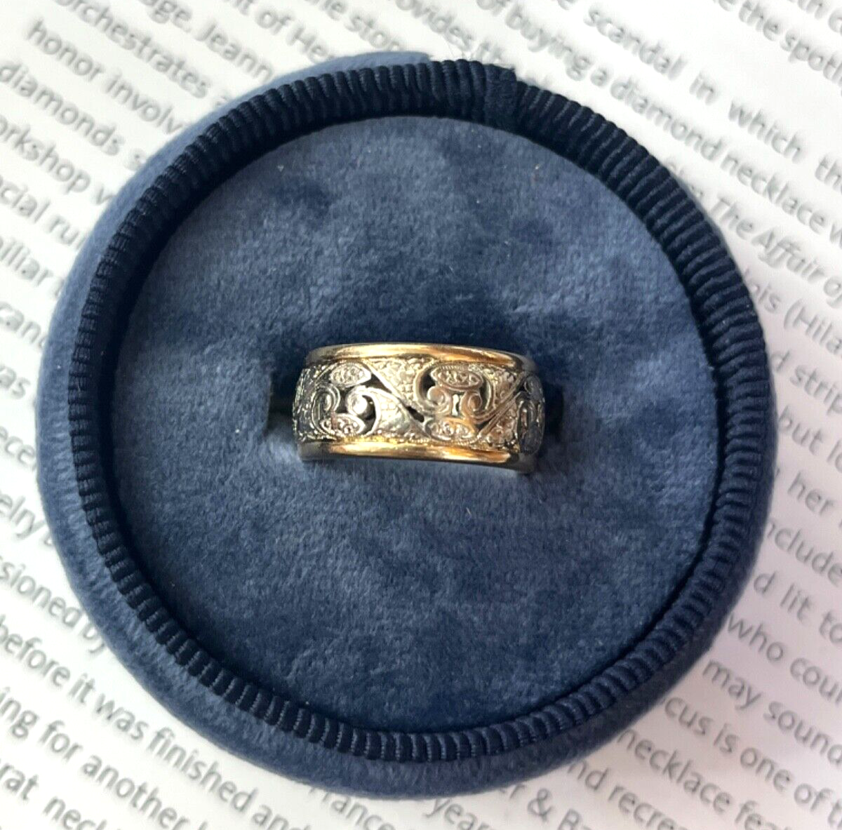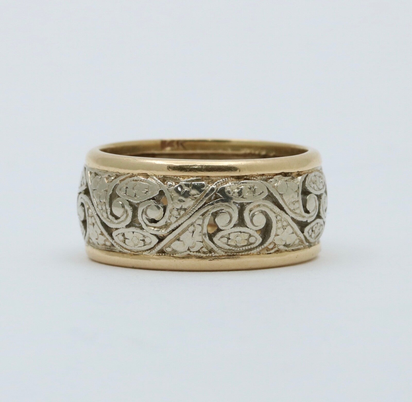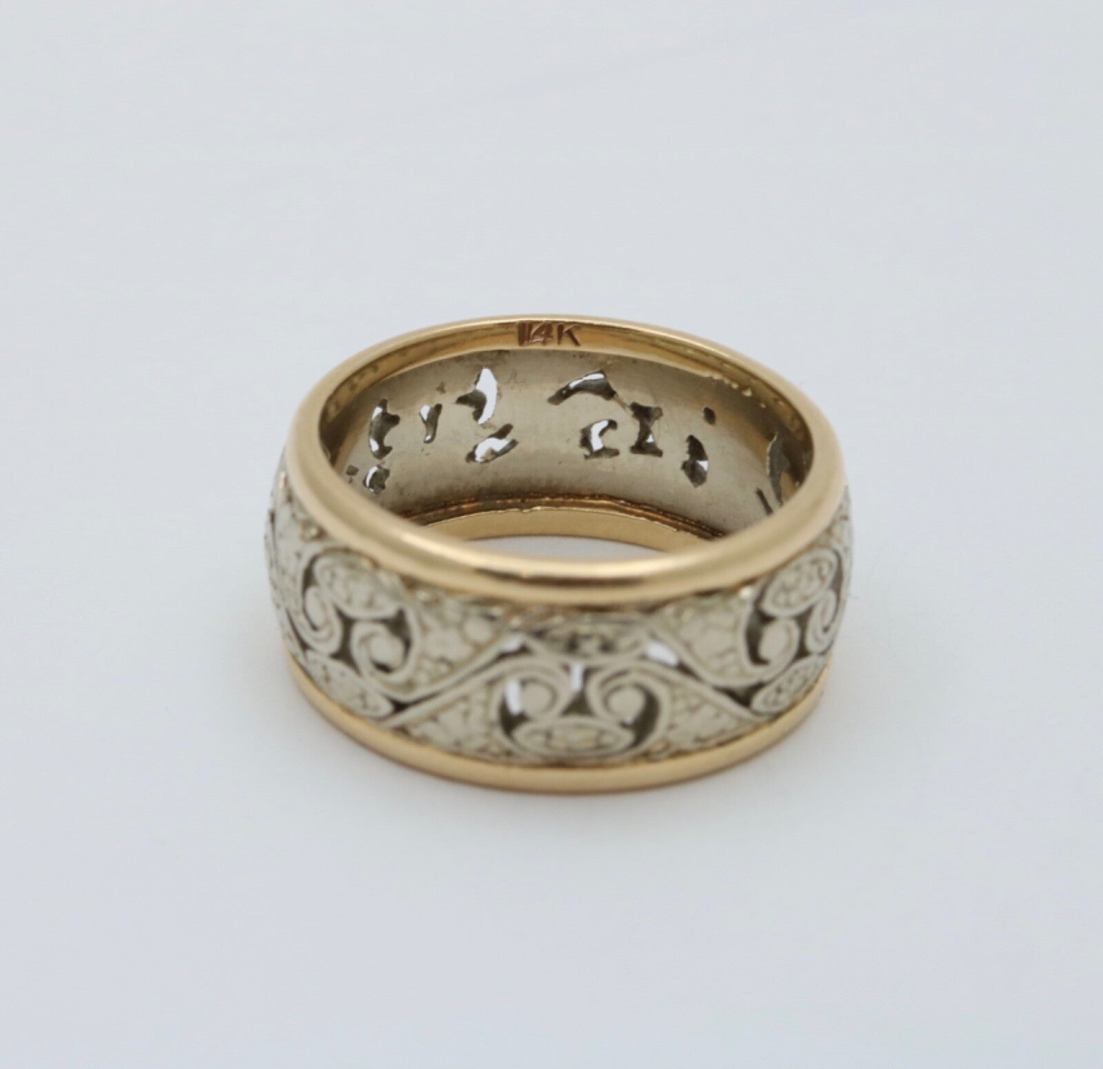 Step into the romance of vintage design with this exquisite 14K white and yellow gold filigree wide band ring. This eye-catching piece brings together the best of both eras - the intricate filigree scrollwork harkens back to the artistry of times past, while the sleek wide band gives it a modern, statement-making edge. The two-tone style plays up the contrast between glowing white gold and rich yellow gold for visual intrigue. Slip this stunner on your finger to infuse your look with timeless glamour. Make this elegant heirloom-quality ring yours today!